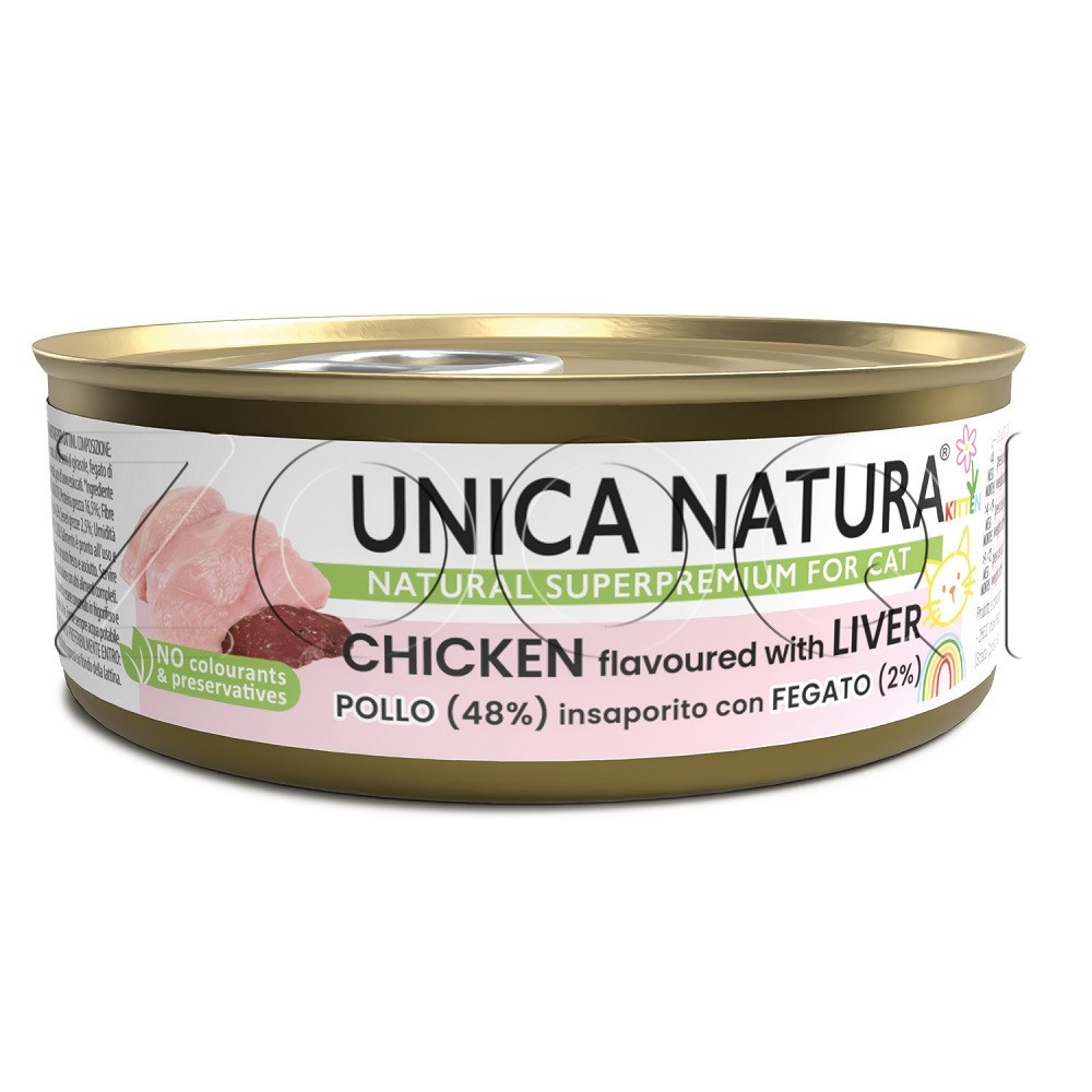 Влажный корм Unica Natura с курицей и печенью в бульоне для котят. Линейка продукции Unica Natura использует уникальные продуктовые и вкусовые сочетания, которые привлекают кошек, не добавляя ароматизаторы и усилители вкуса.