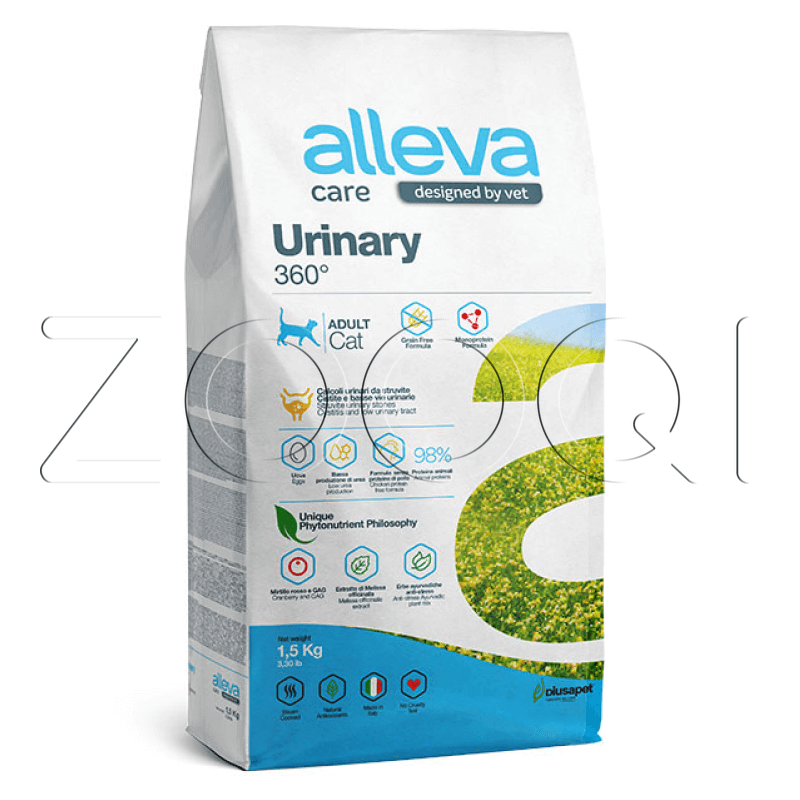 Alleva Care Urinary 360 – полнорационный сухой диетический корм для взрослых кошек, предназначенный для растворения струвитных камней и предотвращения их рецидивов. Он также показан для поддержания здоровья мочевыводящих путей в случаях заболевания нижних отделов мочевыводящих путей кошек и кошачьего урологического синдрома.