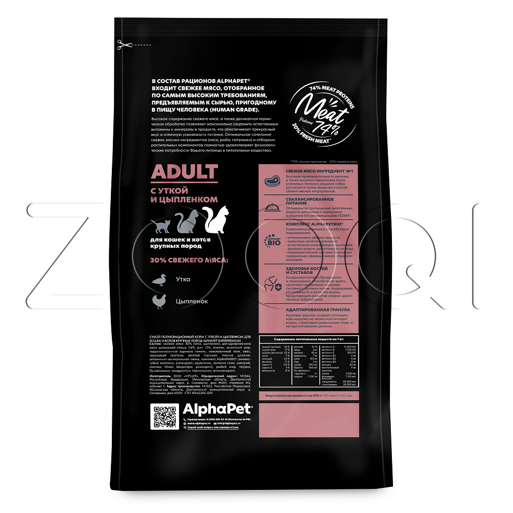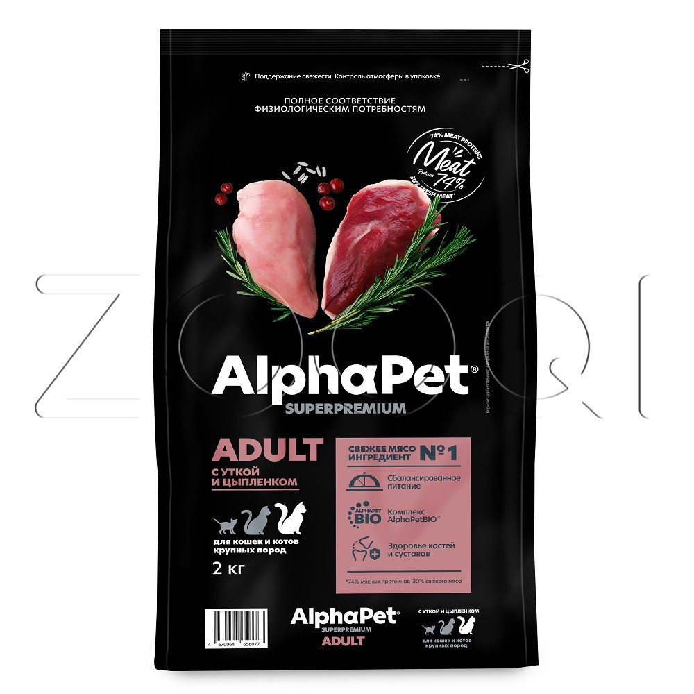 AlphaPet Superpremium Adult – полнорационный сухой корм с уткой и цыпленком для кошек и котов крупных пород.