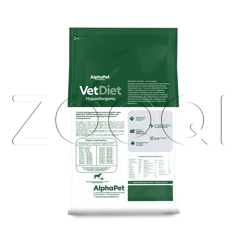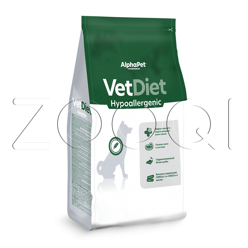 AlphaPet Vet Diet Hypoallergenic – сухой полнорационный диетический корм для взрослых собак при пищевой аллергии и непереносимости ингредиентов.