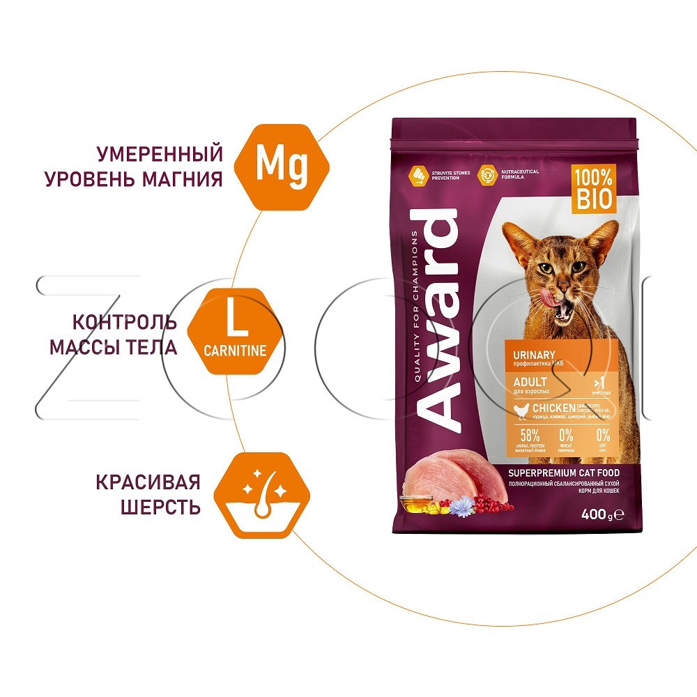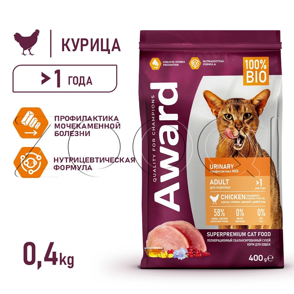 Award Urinary Adult Chicken – полнорационный сбалансированный сухой корм c курицей, с добавлением клюквы, цикория и рыбьего жира для взрослых кошек, для профилактики мочекаменной болезни.