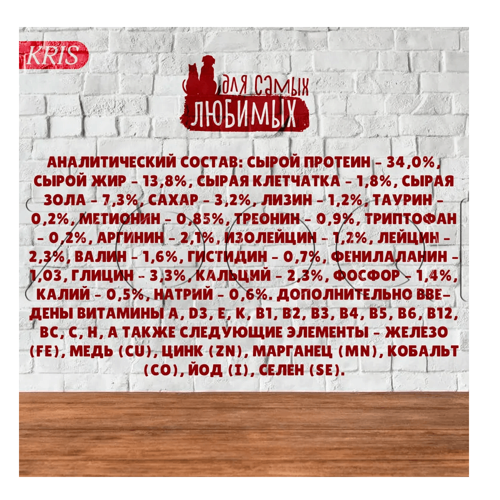 Сырой протеин – 34,0%, сырой жир – 13,8%, сырая клетчатка – 1,8%, сырая зола – 7,3%, сахар – 3,2%, лизин – 1,2%, таурин – 0,2%, метионин – 0,85%, треонин – 0,9%, триптофан – 0,2%, аргинин – 2,1%, изолейцин – 1,2%, лейцин – 2,3%, валин – 1,6%, гистидин – 0,7%, фенилаланин – 1,03, глицин – 3,3%, кальций – 2,3%, фосфор – 1,4%, калий – 0,5%, натрий – 0,6%.