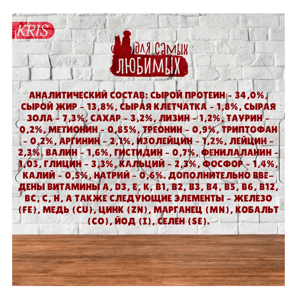 Сырой протеин – 34,0%, сырой жир – 13,8%, сырая клетчатка – 1,8%, сырая зола – 7,3%, сахар – 3,2%, лизин – 1,2%, таурин – 0,2%, метионин – 0,85%, треонин – 0,9%, триптофан – 0,2%, аргинин – 2,1%, изолейцин – 1,2%, лейцин – 2,3%, валин – 1,6%, гистидин – 0,7%, фенилаланин – 1,03, глицин – 3,3%, кальций – 2,3%, фосфор – 1,4%, калий – 0,5%, натрий – 0,6%.
