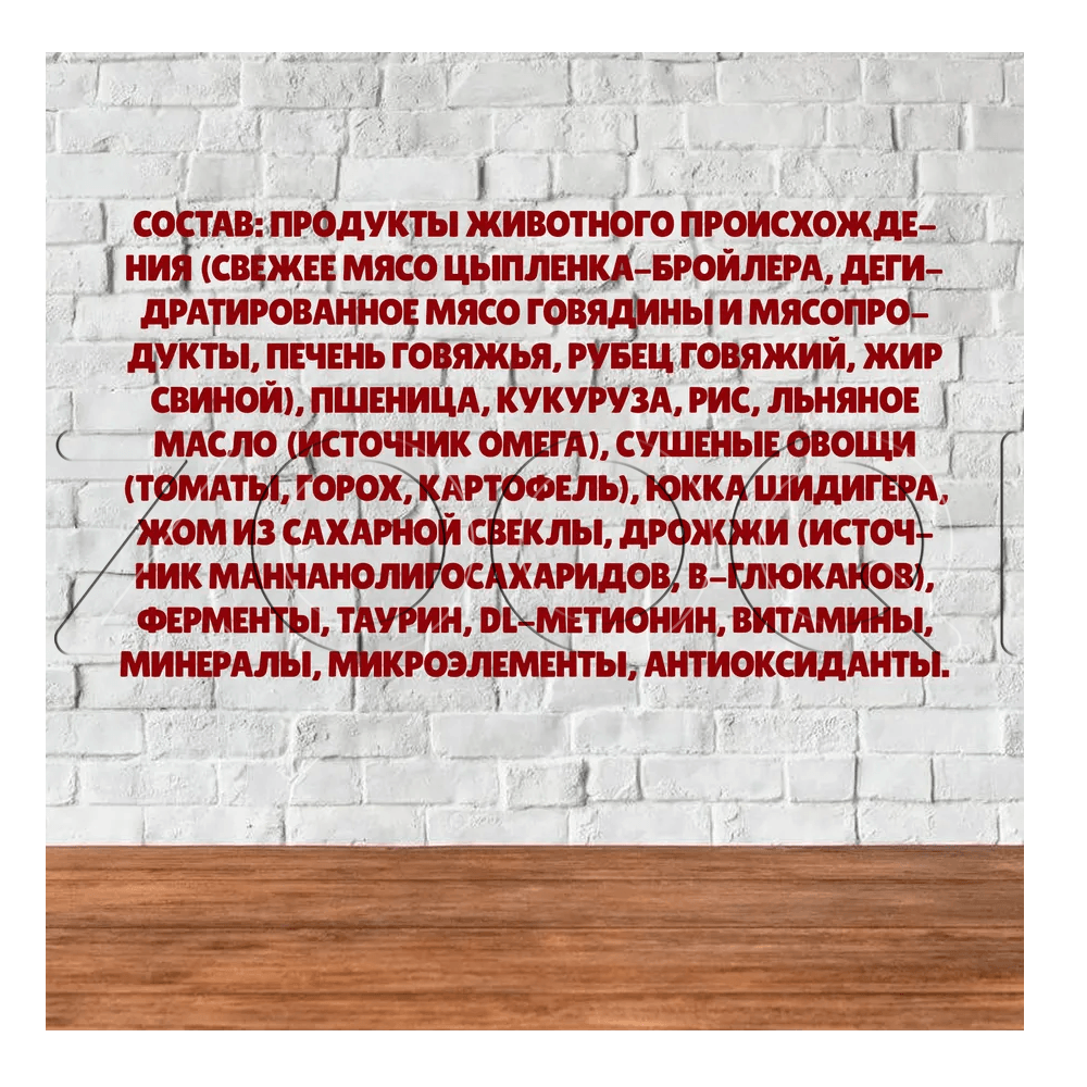 Продукты животного происхождения (свежее мясо цыпленка-бройлера, дегидратированное мясо говядины и мясопродукты, печень говяжья, рубец говяжий, жир свиной), пшеница, кукуруза, рис, льняное масло (источник омега), сушеные овощи (томаты, горох, картофель), юкка Шидигера, жом из сахарной свеклы, дрожжи (источник маннанолигосахаридов, B-глюканов), ферменты, таурин, DL-метионин, витамины, минералы, микроэлементы, антиоксиданты.