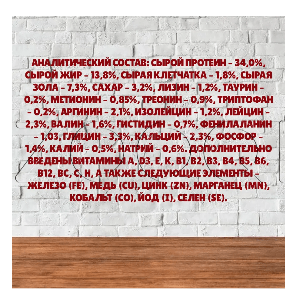 Сырой протеин – 34,0%, сырой жир – 13,8%, сырая клетчатка – 1,8%, сырая зола – 7,3%, сахар – 3,2%, лизин – 1,2%, таурин – 0,2%, метионин – 0,85%, треонин – 0,9%, триптофан – 0,2%, аргинин – 2,1%, изолейцин – 1,2%, лейцин – 2,3%, валин – 1,6%, гистидин – 0,7%, фенилаланин – 1,03, глицин – 3,3%, кальций – 2,3%, фосфор – 1,4%, калий – 0,5%, натрий – 0,6%.