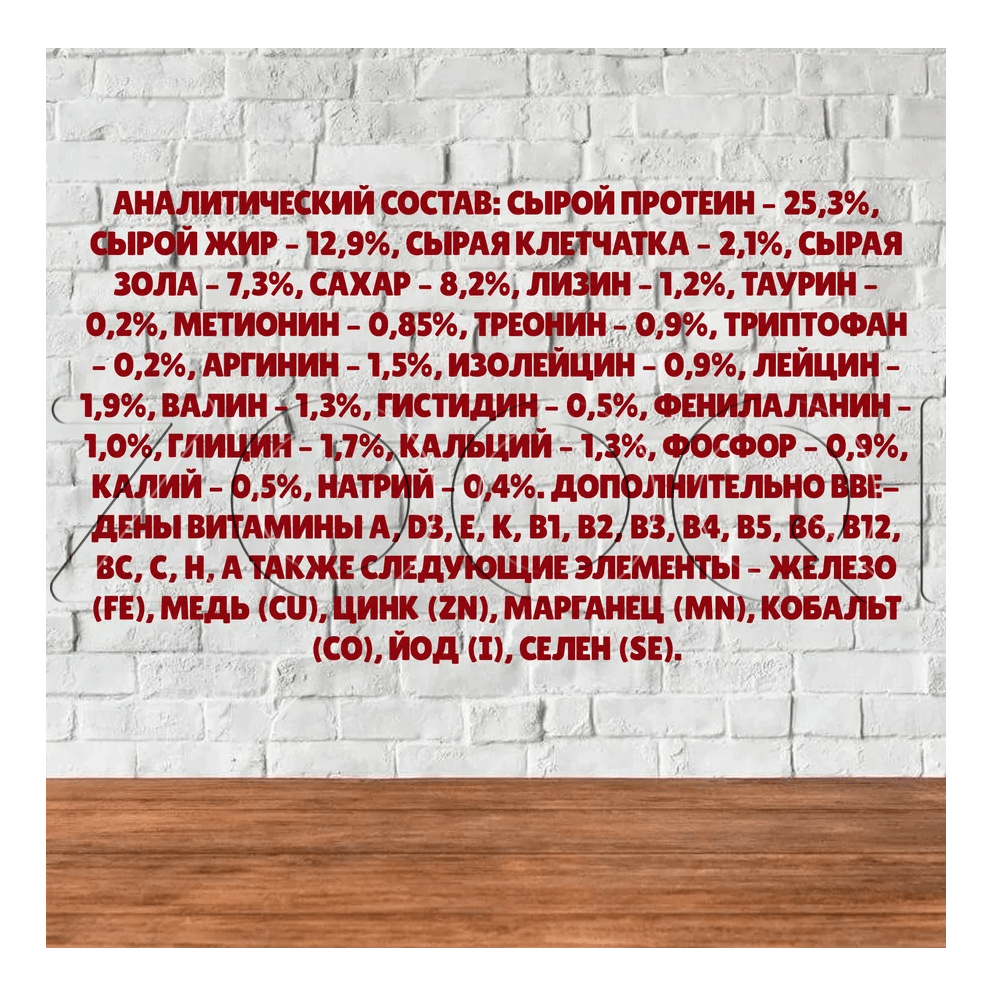 Сырой протеин – 25,3%, сырой жир – 12,9%, сырая клетчатка – 2,1%, сырая зола – 7,3%, сахар – 8,2%, лизин – 1,2%, таурин – 0,2%, метионин – 0,85%, треонин – 0,9%, триптофан – 0,2%, аргинин – 1,5%, изолейцин – 0,9%, лейцин – 1,9%, валин – 1,3%, гистидин – 0,5%, фенилаланин – 1,0%, глицин – 1,7%, кальций – 1,3%, фосфор – 0,9%, калий – 0,5%, натрий – 0,4%.