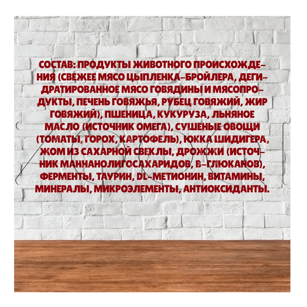 Продукты животного происхождения (свежее мясо цыпленка-бройлера, дегидратированное мясо говядины и мясопродукты, печень говяжья, рубец говяжий, жир говяжий), пшеница, кукуруза, льняное масло (источник омега), сушеные овощи (томаты, горох, картофель), юкка Шидигера, жом из сахарной свеклы, дрожжи (источник маннанолигосахаридов, B-глюканов), ферменты, таурин, DL-метионин, витамины, минералы, микроэлементы, антиоксиданты.