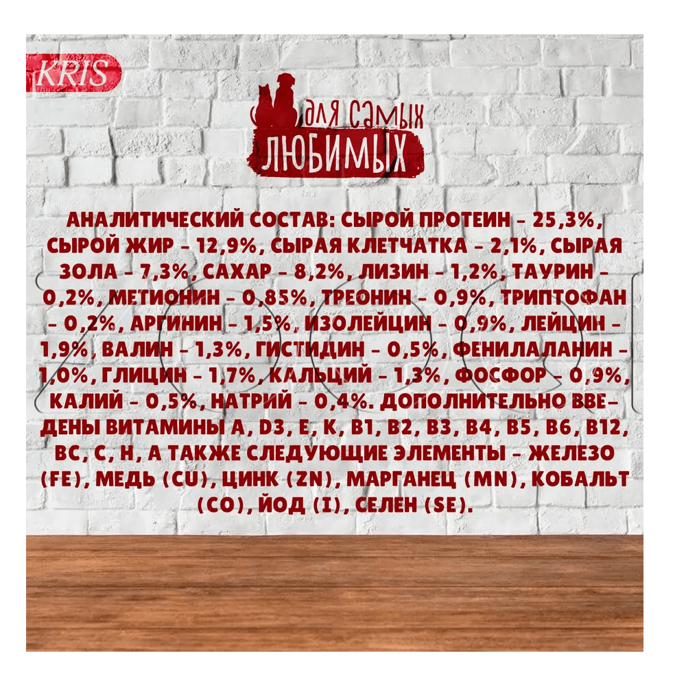 Сырой протеин – 25,3%, сырой жир – 12,9%, сырая клетчатка – 2,1%, сырая зола – 7,3%, сахар – 8,2%, лизин – 1,2%, таурин – 0,2%, метионин – 0,85%, треонин – 0,9%, триптофан – 0,2%, аргинин – 1,5%, изолейцин – 0,9%, лейцин – 1,9%, валин – 1,3%, гистидин – 0,5%, фенилаланин – 1,0%, глицин – 1,7%, кальций – 1,3%, фосфор – 0,9%, калий – 0,5%, натрий – 0,4%.