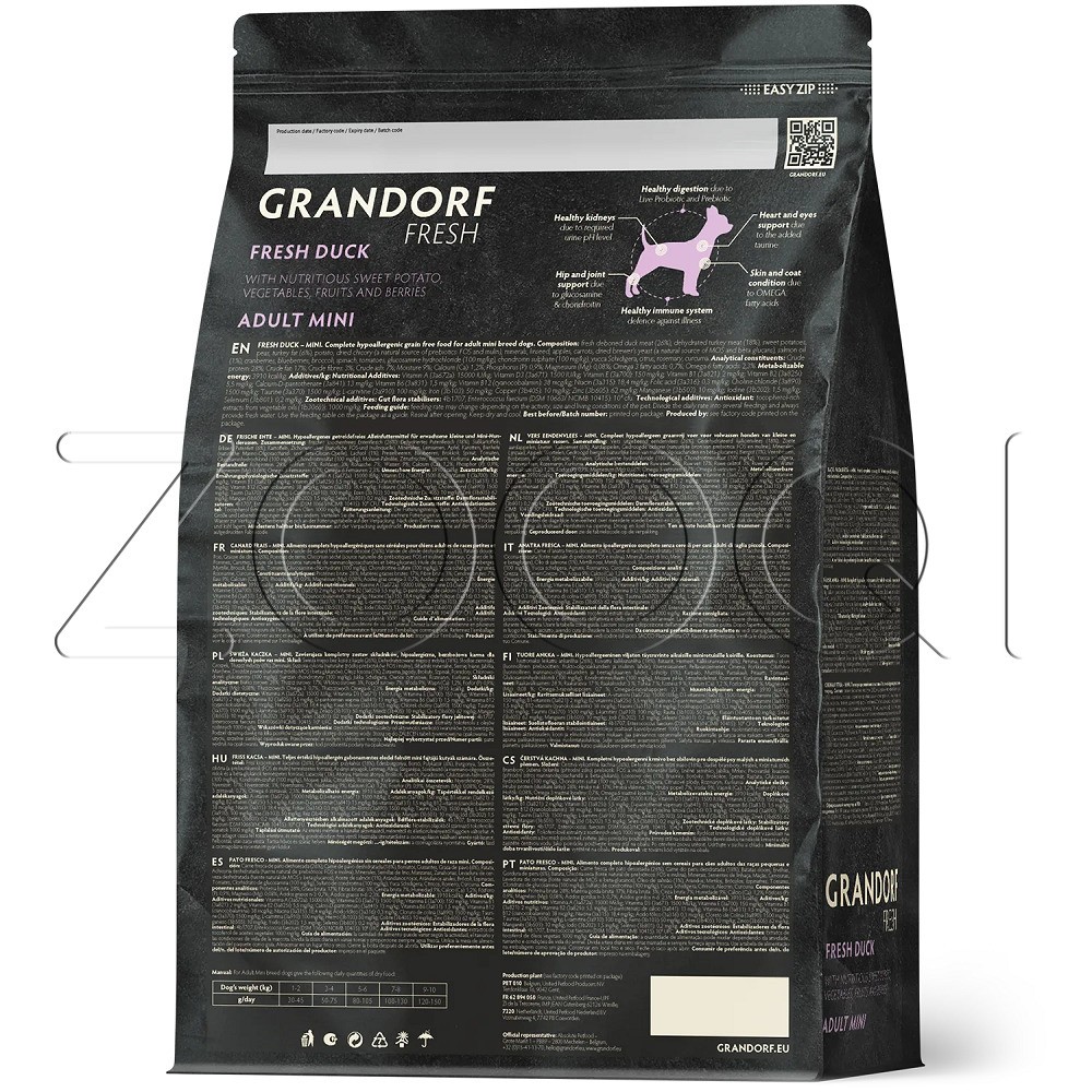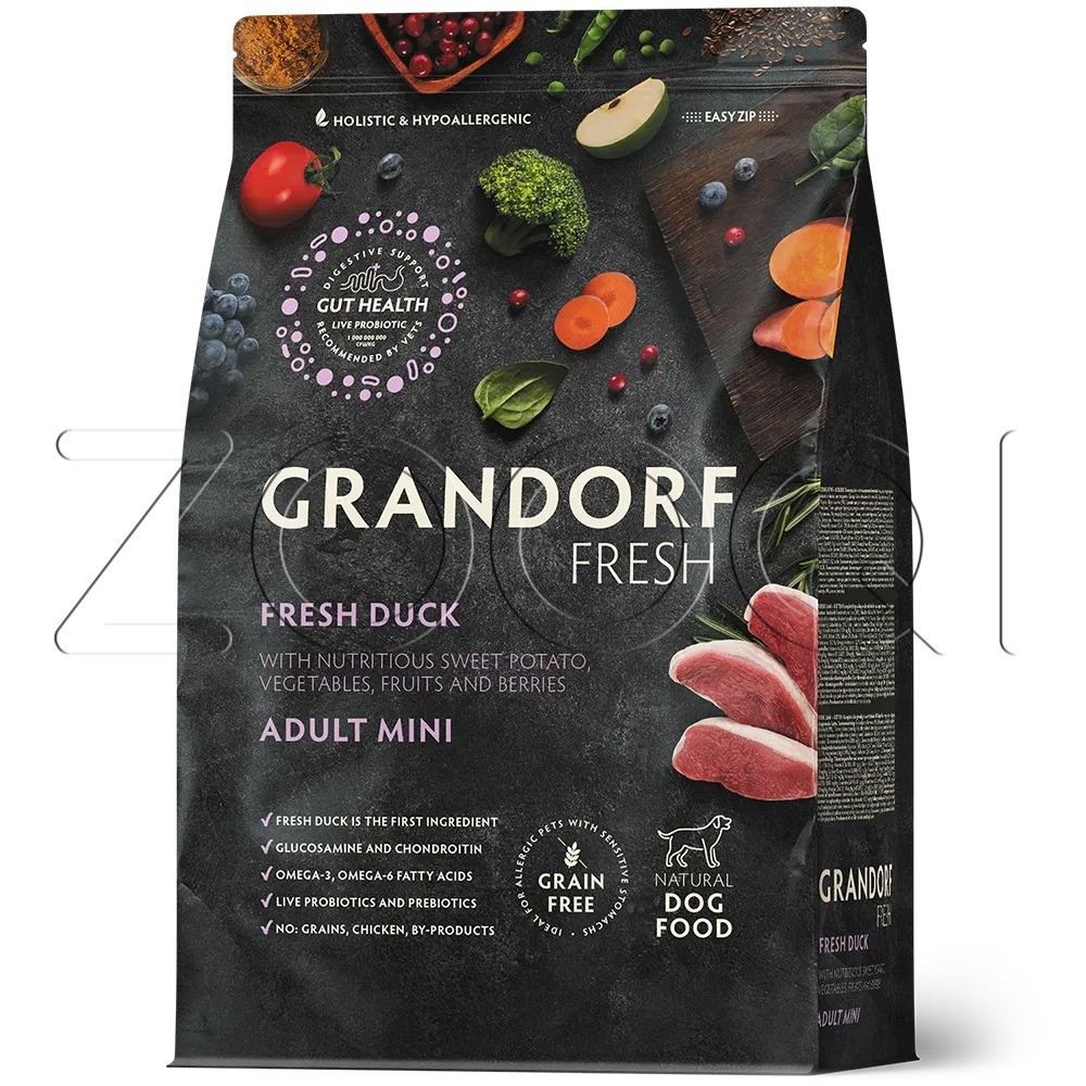Grandorf Dog Fresh Duck & Sweet Potato Adult Mini Breeds (свежая утка с бататом) – беззерновой корм с живыми пробиотиками для взрослых собак мелких пород с чувствительным пищеварением или склонных к аллергии.
