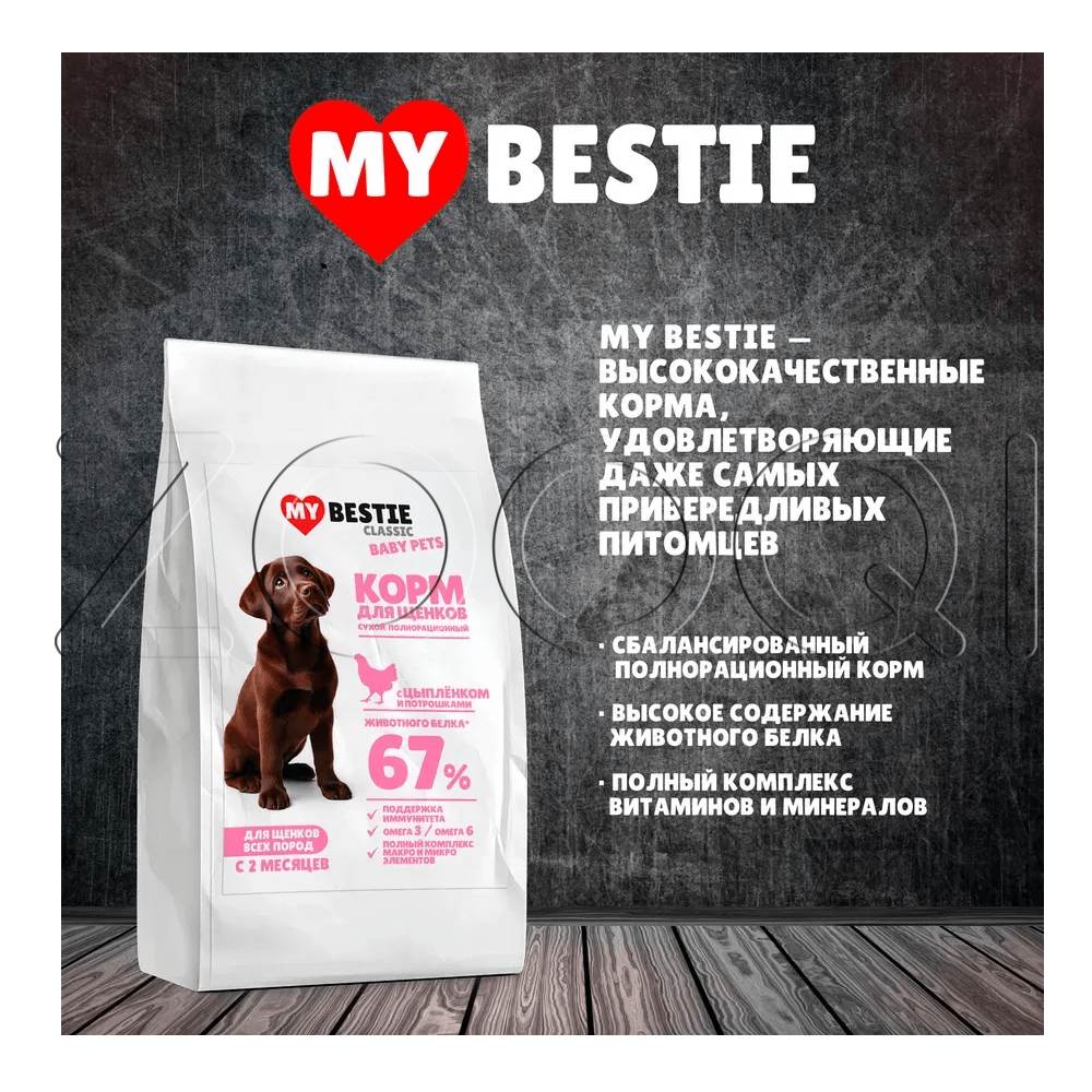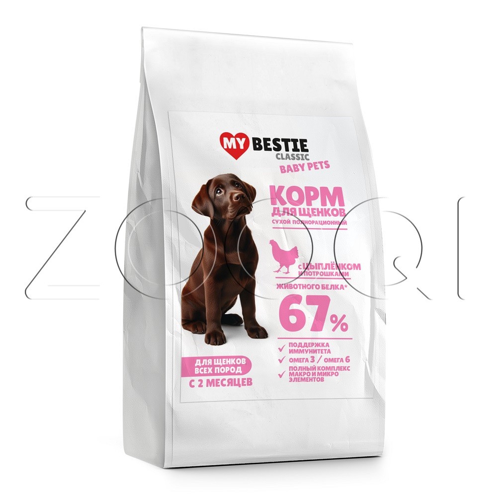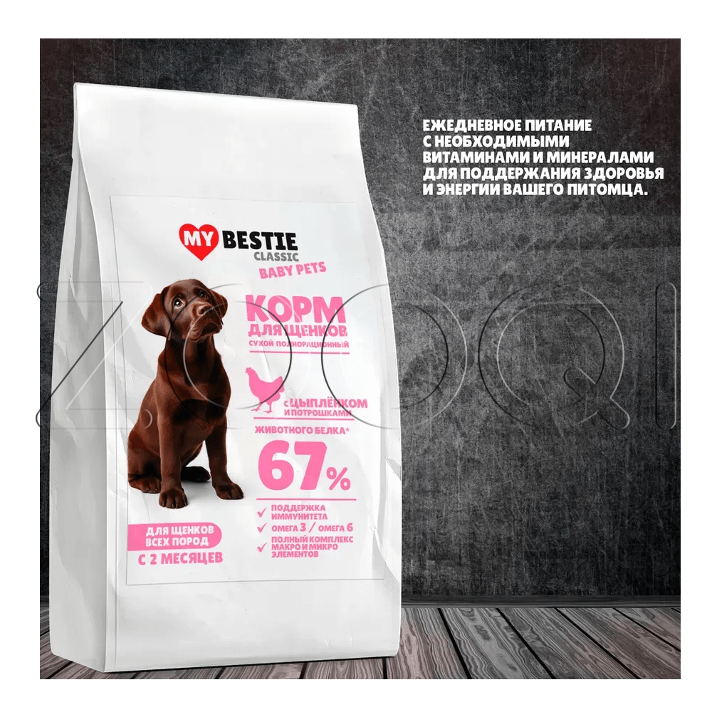 MуBestie Classic с цыпленком и потрошками – полнорационный сбалансированный сухой корм для щенков всех пород с 2 месяцев.
