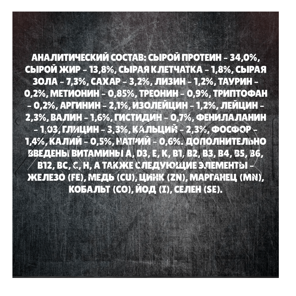 Сырой протеин – 25,3%, сырой жир – 12,9%, сырая клетчатка – 2,1%, сырая зола – 7,3%, сахар – 8,2%, лизин – 1,2%, таурин – 0,2%, метионин – 0,85%, треонин – 0,9%, триптофан – 0,2%, аргинин – 1,5%, изолейцин – 0,9%, лейцин – 1,9%, валин – 1,3%, гистидин – 0,5%, фенилаланин – 1,0%, глицин – 1,7%, кальций – 1,3%, фосфор – 0,9%, калий – 0,5%, натрий – 0,4%.