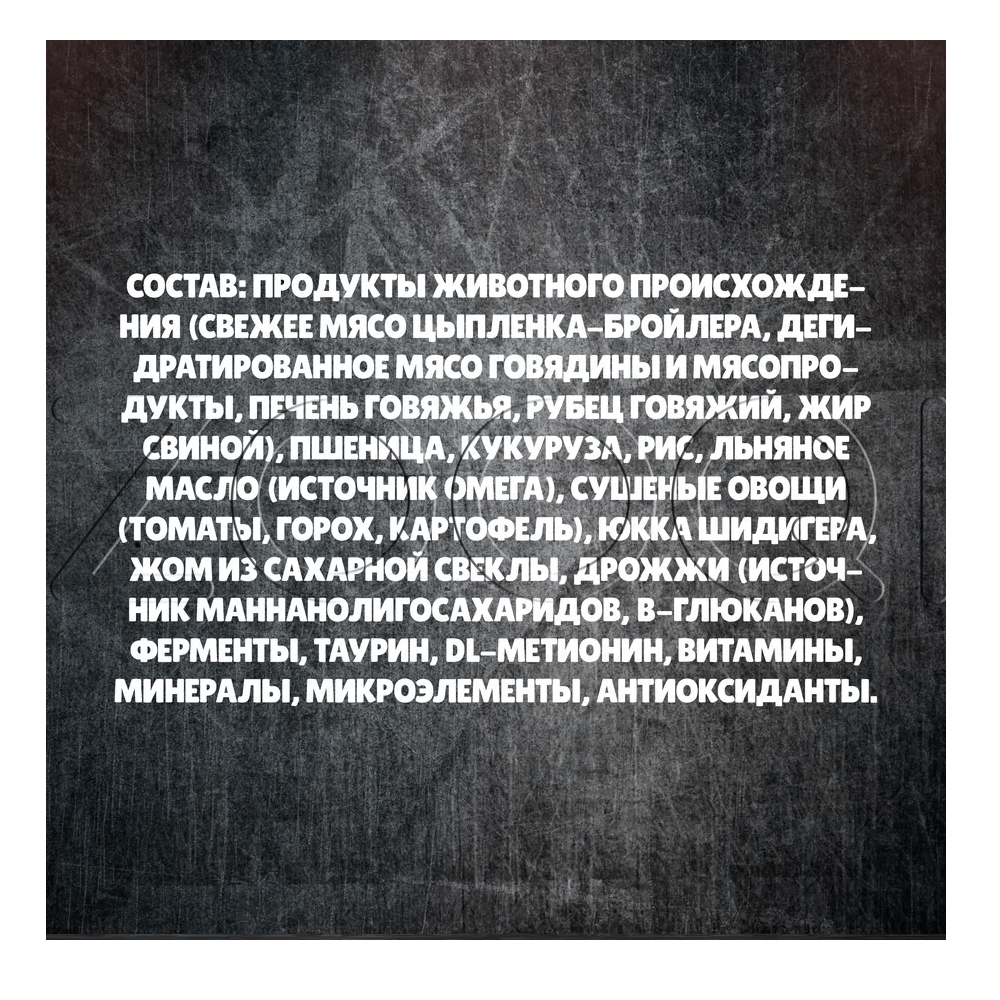 Продукты животного происхождения (свежее мясо говядины, дегидратированное мясо говядины и мясопродукты, печень говяжья, рубец говяжий, жир говяжий), пшеница, кукуруза, льняное масло (источник омега), сушеные овощи (томаты, горох, картофель), юкка Шидигера, жом из сахарной свеклы, дрожжи (источник маннанолигосахаридов, B-глюканов), ферменты, таурин, DL-метионин, витамины, минералы, микроэлементы, антиоксиданты.