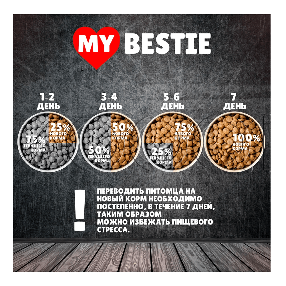 Переход на новый корм – это важный процесс, который требует внимания, чтобы ваш питомец с удовольствием принял новый рацион. MyBestie рекомендует проводить смену корма плавно, чтобы питомец постепенно адаптировался к новому вкусу и составу.