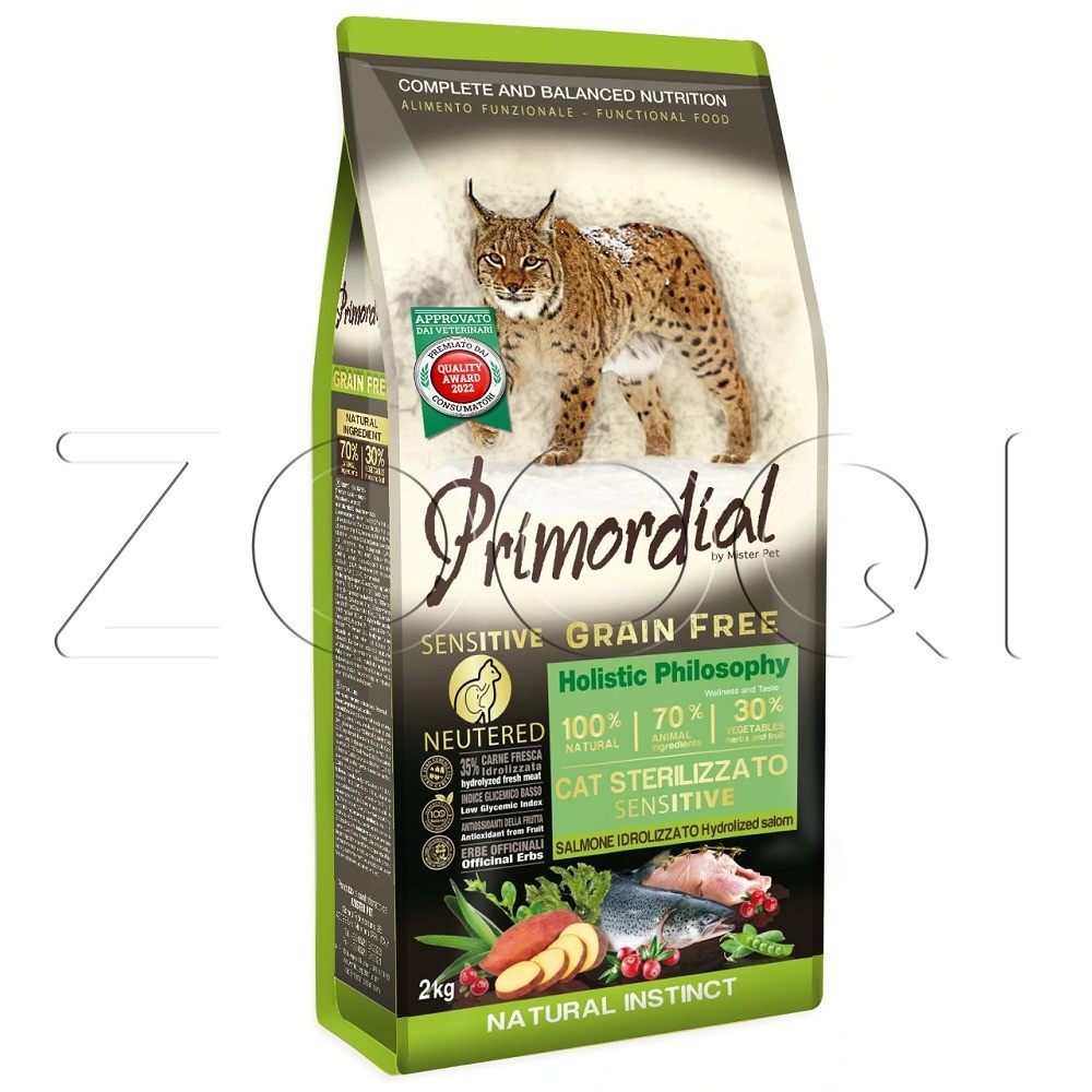 Primordial Cat Adult Neutered Sensitive Salmon – беззерновой полнорационный корм с гидролизованным лососем для взрослых стерилизованных кошек c чувствительным пищеварением.