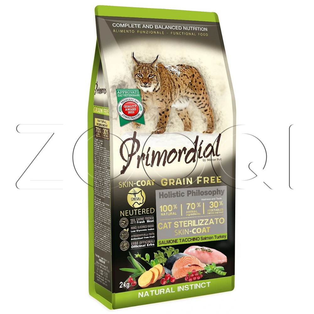 Primordial Cat Adult Neutered Salmon & Turkey — беззерновой полнорационный корм с лососем и индейкой для здоровья кожи и шерсти взрослых стерилизованных кошек.