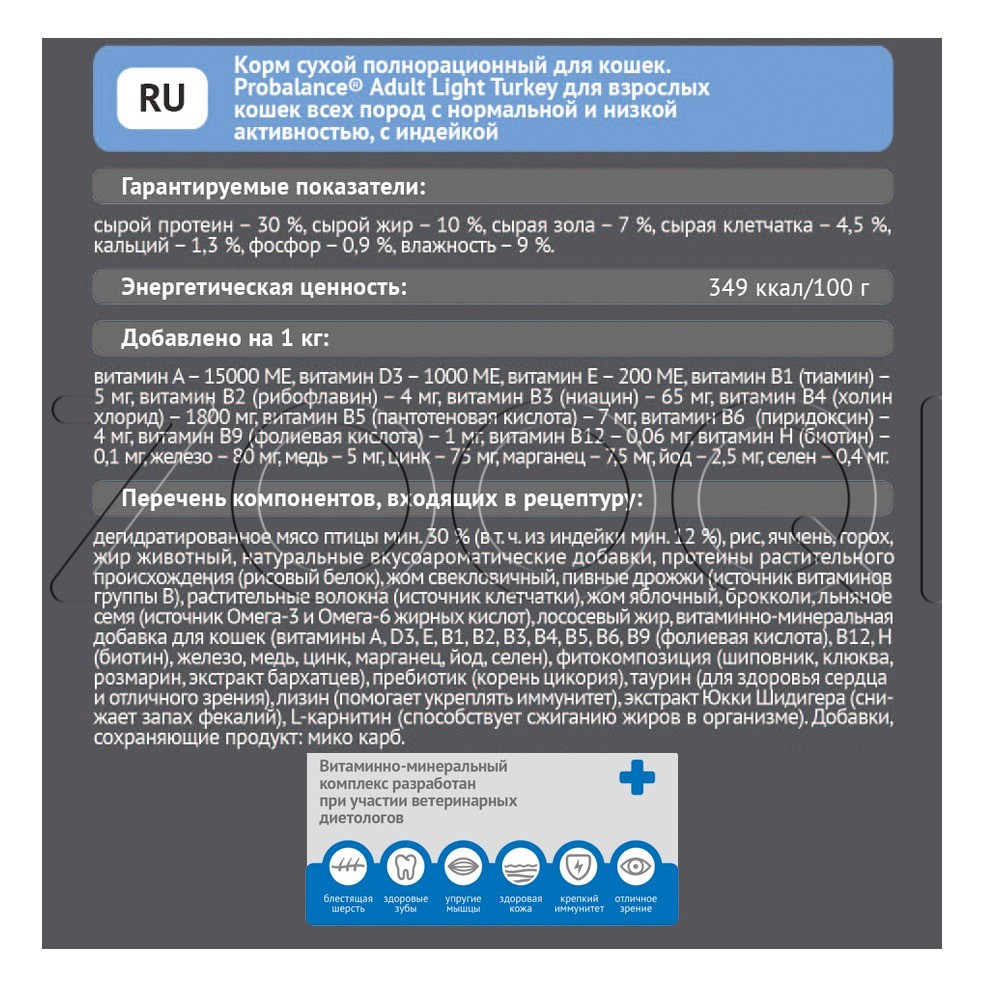 ProBalance Light – полнорационный натуральный сухой корм премиум класса для кошек с лишним весом. Рацион подходит питомцам, склонным к полноте или ведущим малоподвижный образ жизни. Основа корма – мясо двух видов (курицы и индейки). Это важные источники животного белка, который каждый день нужен кошкам. Рацион рекомендован для ежедневного кормления взрослых кошек всех пород.