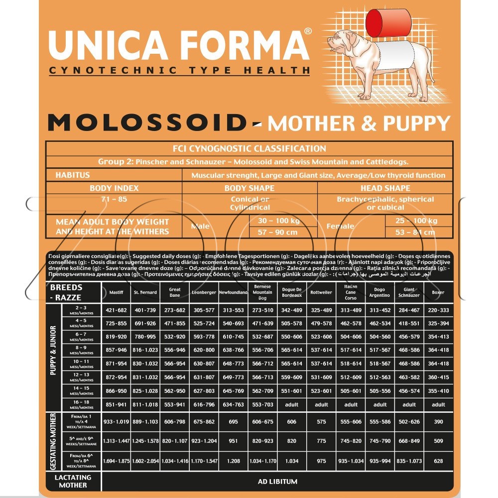 Полноценный корм супер-премиум качества Unica Forma Molossoid Mother & Puppy с уткой для щенков, беременных и кормящих собак.
