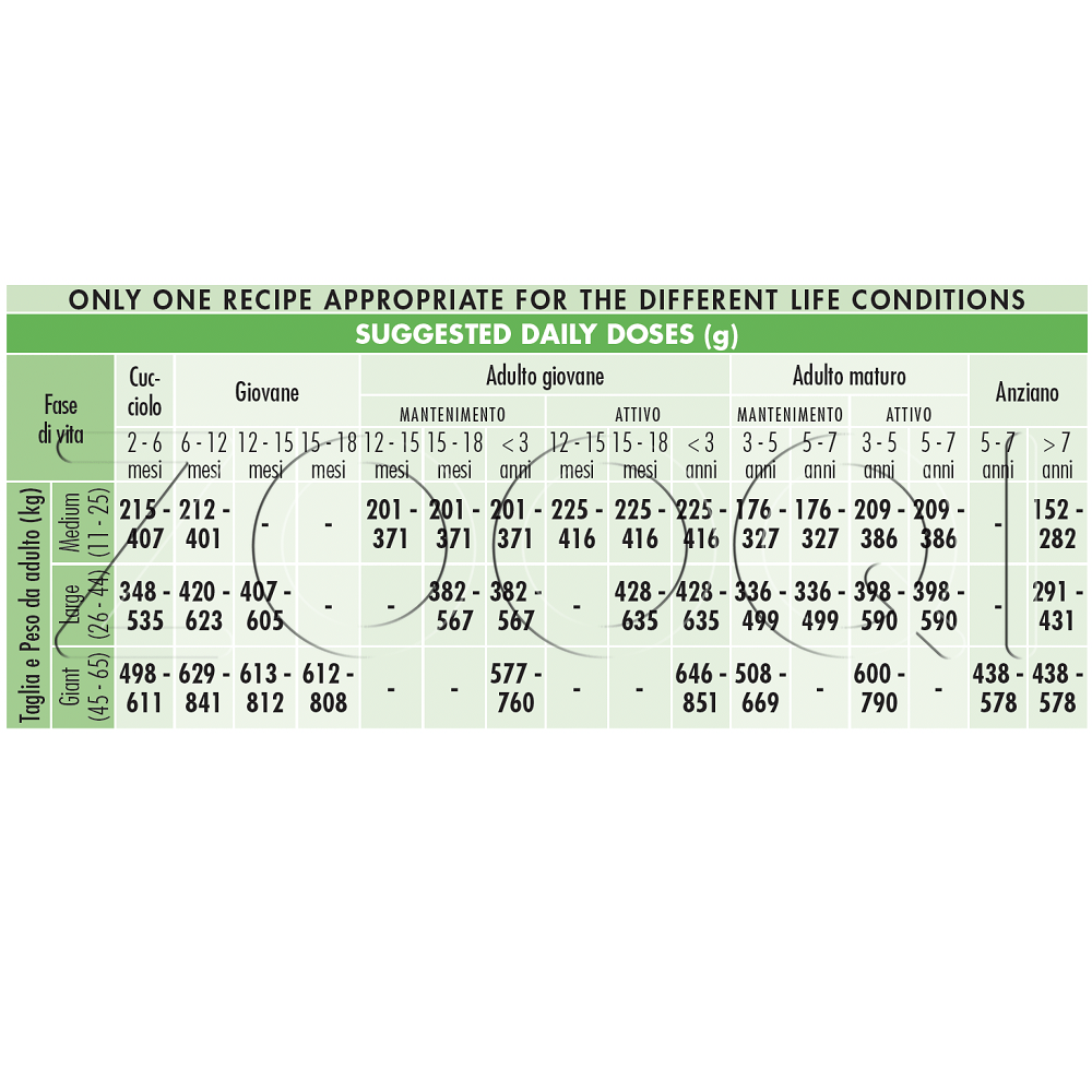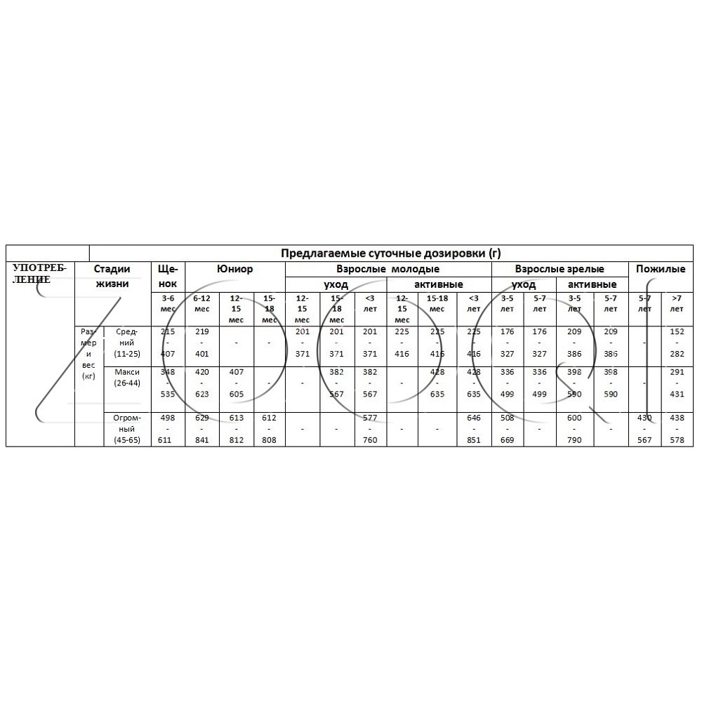 Дегидратированный белок ягненка (16,5%*), рис (15%), белок кукурузы, кукуруза, конские бобы (10%), белое сорго, куриный жир, сушеная свекольная мякоть, свежее мясо ягненка (4%), кукурузная мука, гидролизованные животные белки, глюкозамин.