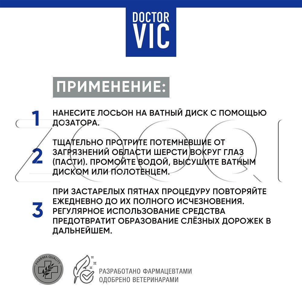 Лосьон Doctor VIC для очищения шерсти от слезных пятен предназначен для удаления пятен от слез и слюны у кошек и собак. Он мягко очищает шерсть вокруг глаз и пасти от загрязнений, которые наиболее заметны у животных со светлой и белой шерстью, не вызывает раздражения. Восстанавливает цвет шерсти, придает ей блеск и здоровый вид. Важно, при застарелых или ярко выраженных пятнах повторяйте процедуру ежедневно до их полного исчезновения. Регулярное использование средства предотвратит образование слезных дорожек в дальнейшем.
