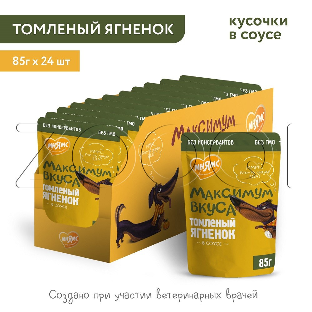 Мнямс Максимум Вкуса – консервированный полнорационный корм с ягненком в соусе для собак.