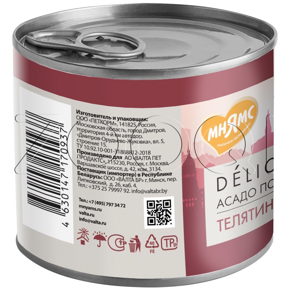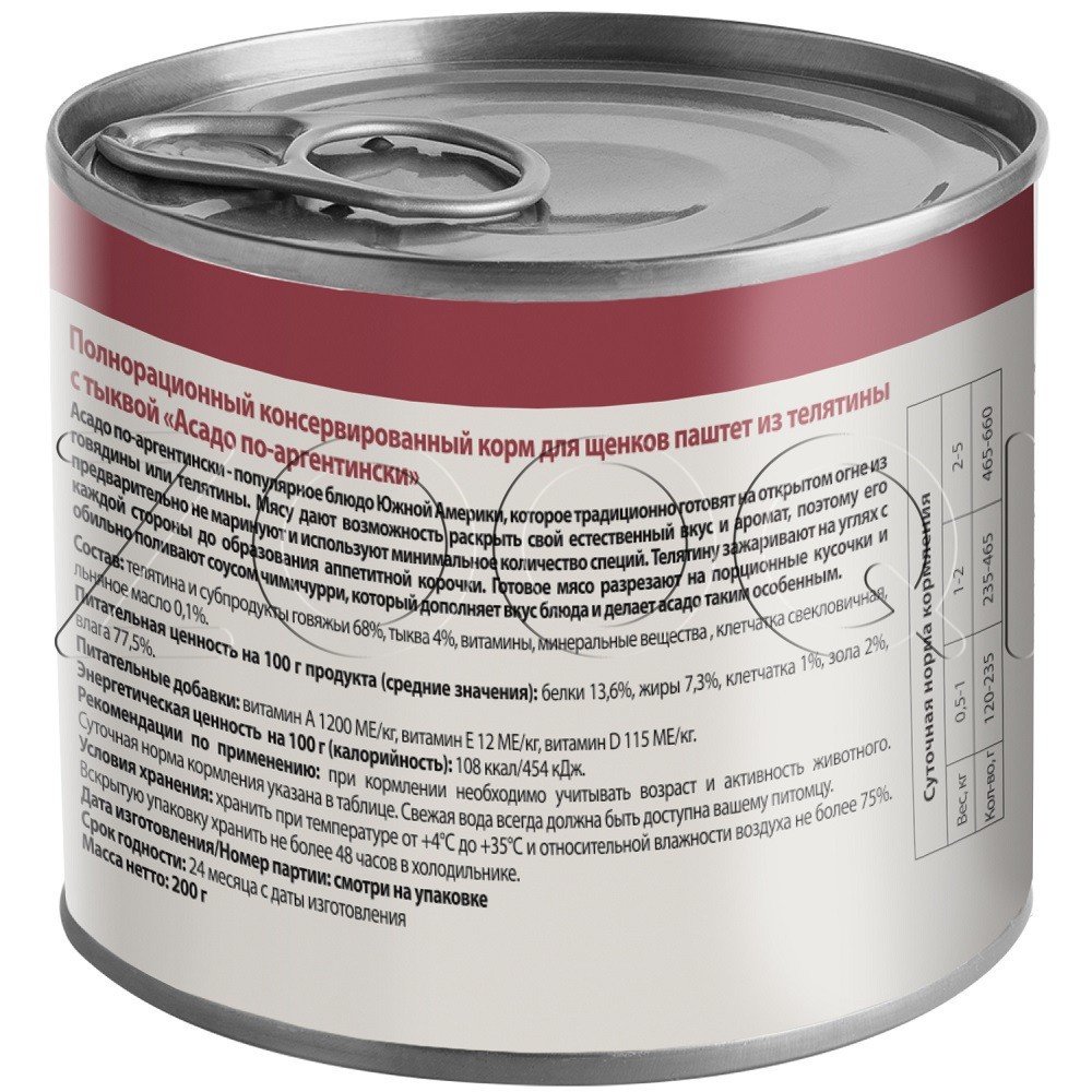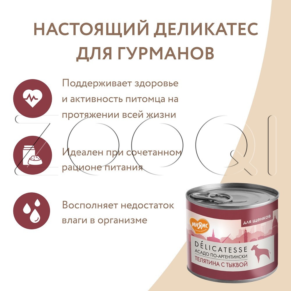 Мнямс «Асадо по-аргентински» – полнорационный консервированный корм из телятины с тыквой для щенков. Суперпремиальный паштет с высоким содержанием мяса, созданный по мотивам культовых рецептов разных стран, адаптированных под щенков всех пород.