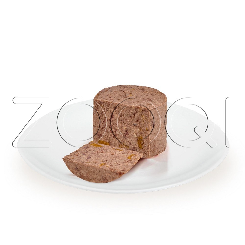 Телятина и субпродукты говяжьи 68%, тыква 4%, витамины, минеральные вещества, свекловичная клетчатка, льняное масло 0,1%.