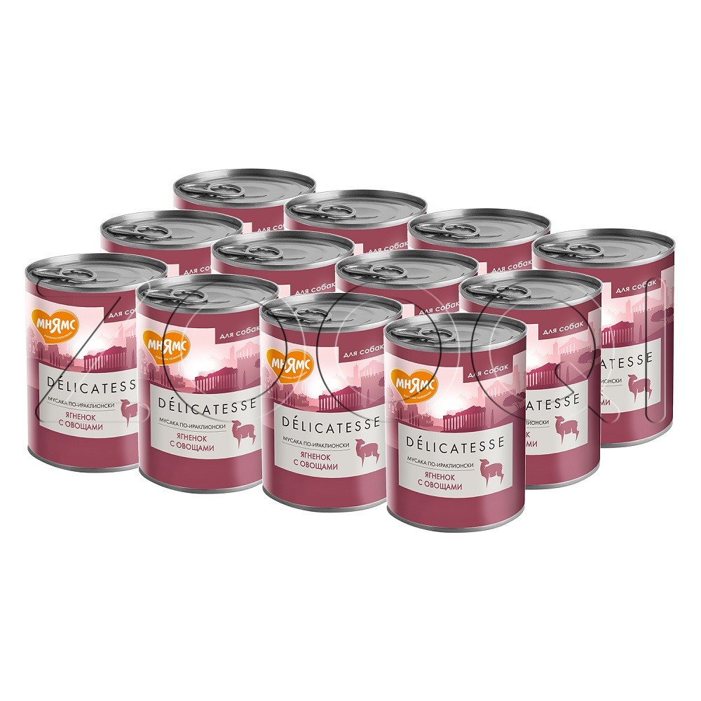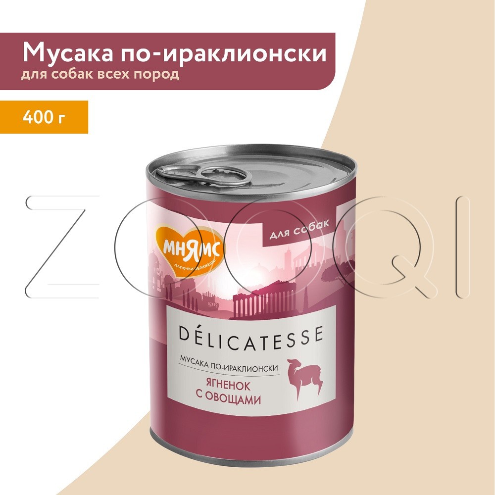 Мнямс Деликатес «Мусака по-ираклионски» – полнорационный консервированный корм из ягнёнка с овощами для собак всех пород. Суперпремиальный паштет с высоким содержанием мяса, созданный по мотивам культовых рецептов разных стран, адаптированных под собак всех пород.