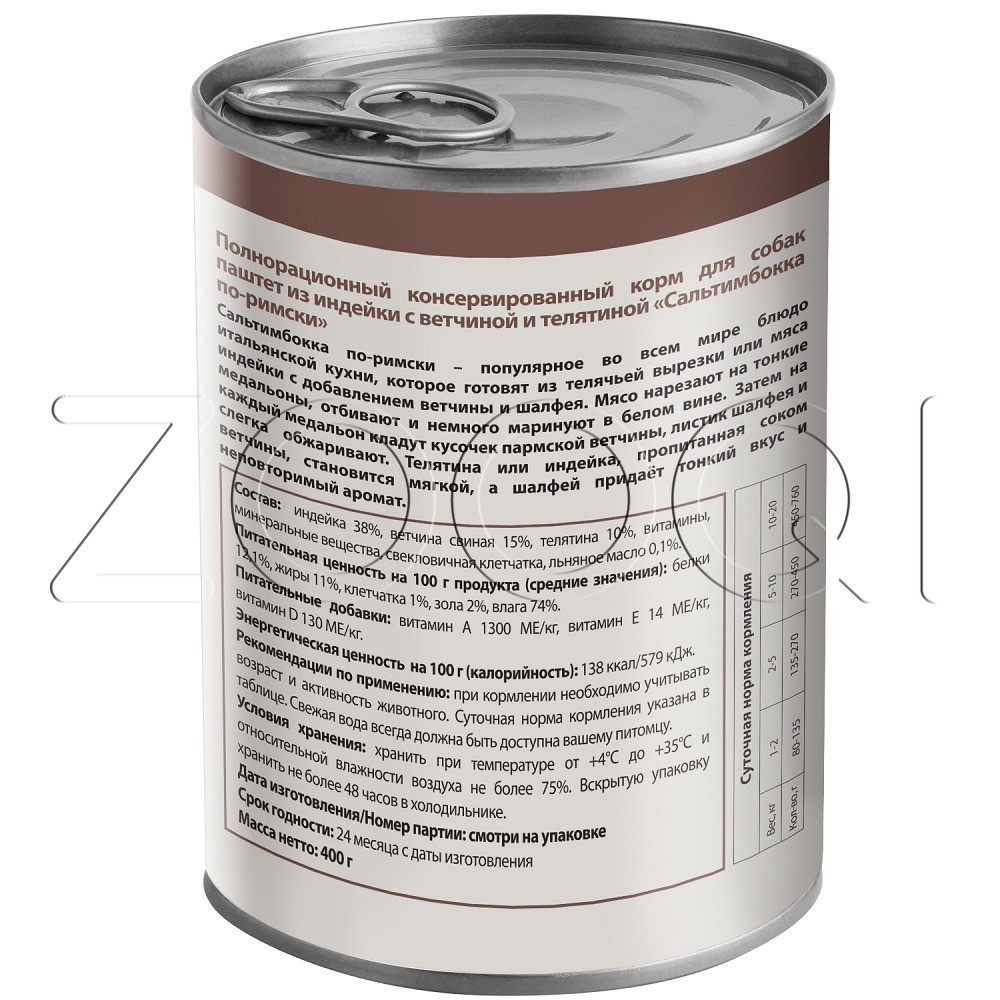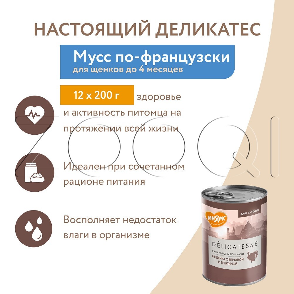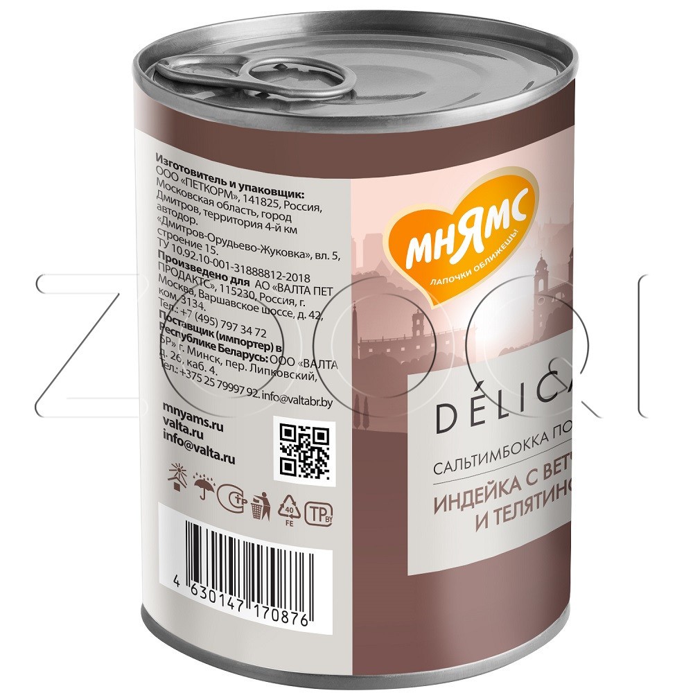 Мнямс Деликатес «Сальтимбокка по-римски» – полнорационный консервированный корм из индейки с ветчиной и телятиной для собак. Суперпремиальный паштет с высоким содержанием мяса, созданный по мотивам культовых рецептов разных стран, адаптированных под собак всех пород.
