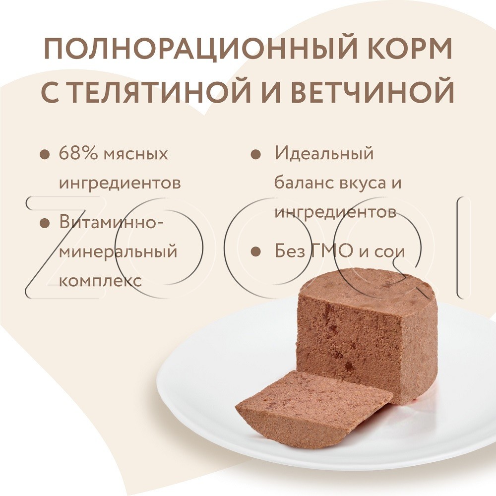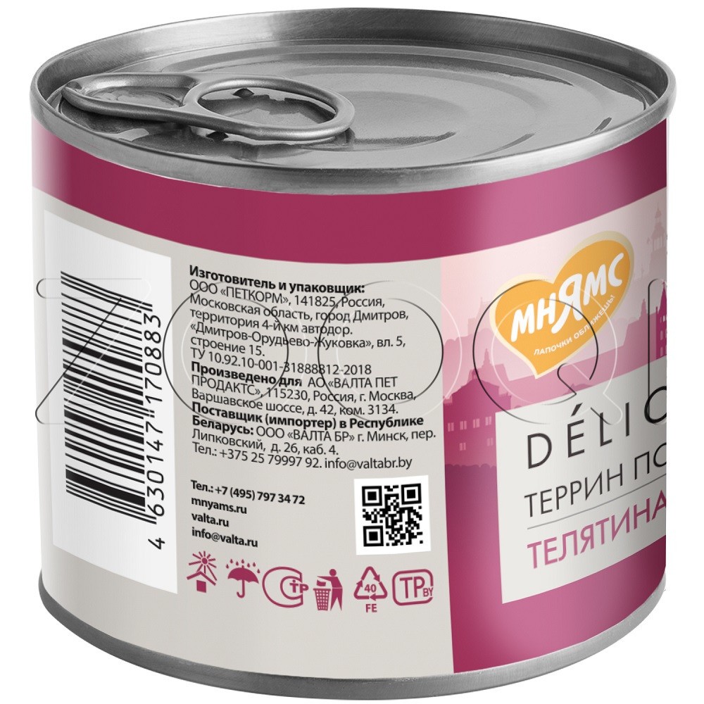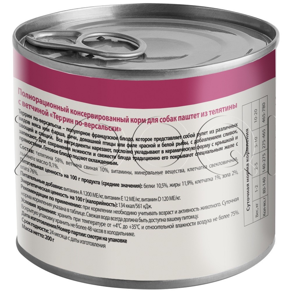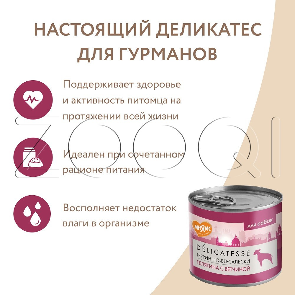 Мнямс «Террин по-версальски» – полнорационный консервированный корм из телятины с ветчиной для собак. Суперпремиальный паштет с высоким содержанием мяса, созданный по мотивам культовых рецептов разных стран, адаптированных под собак всех пород.
