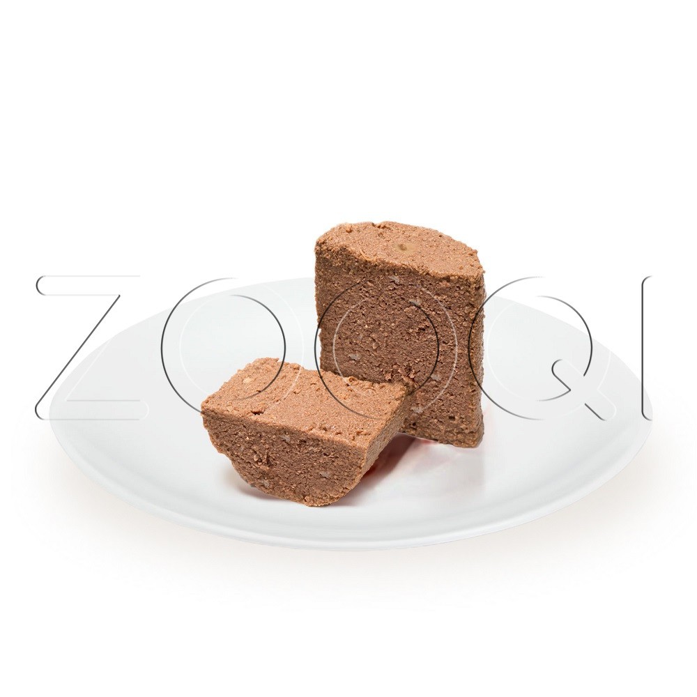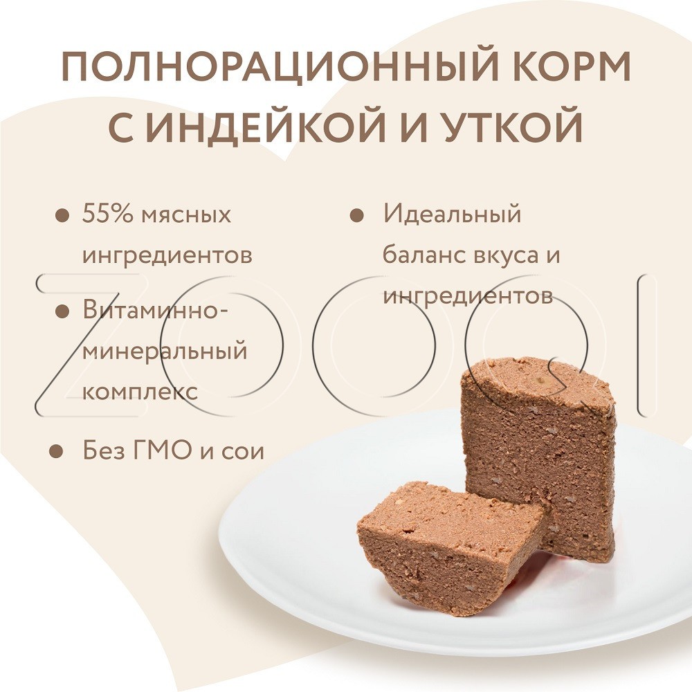 Индейка 55%, утка 15%, витамины, минеральные вещества, свекловичная клетчатка, льняное масло 0,1%.