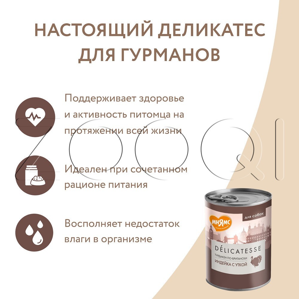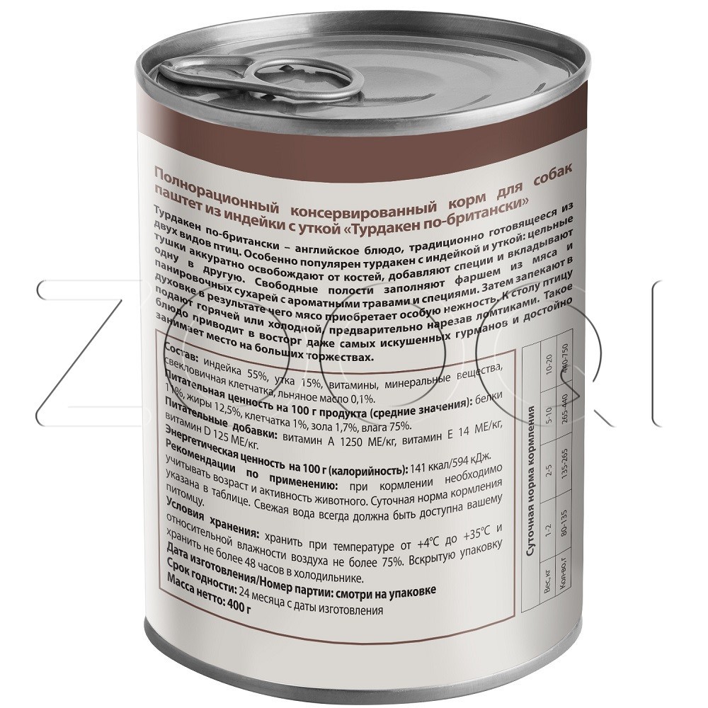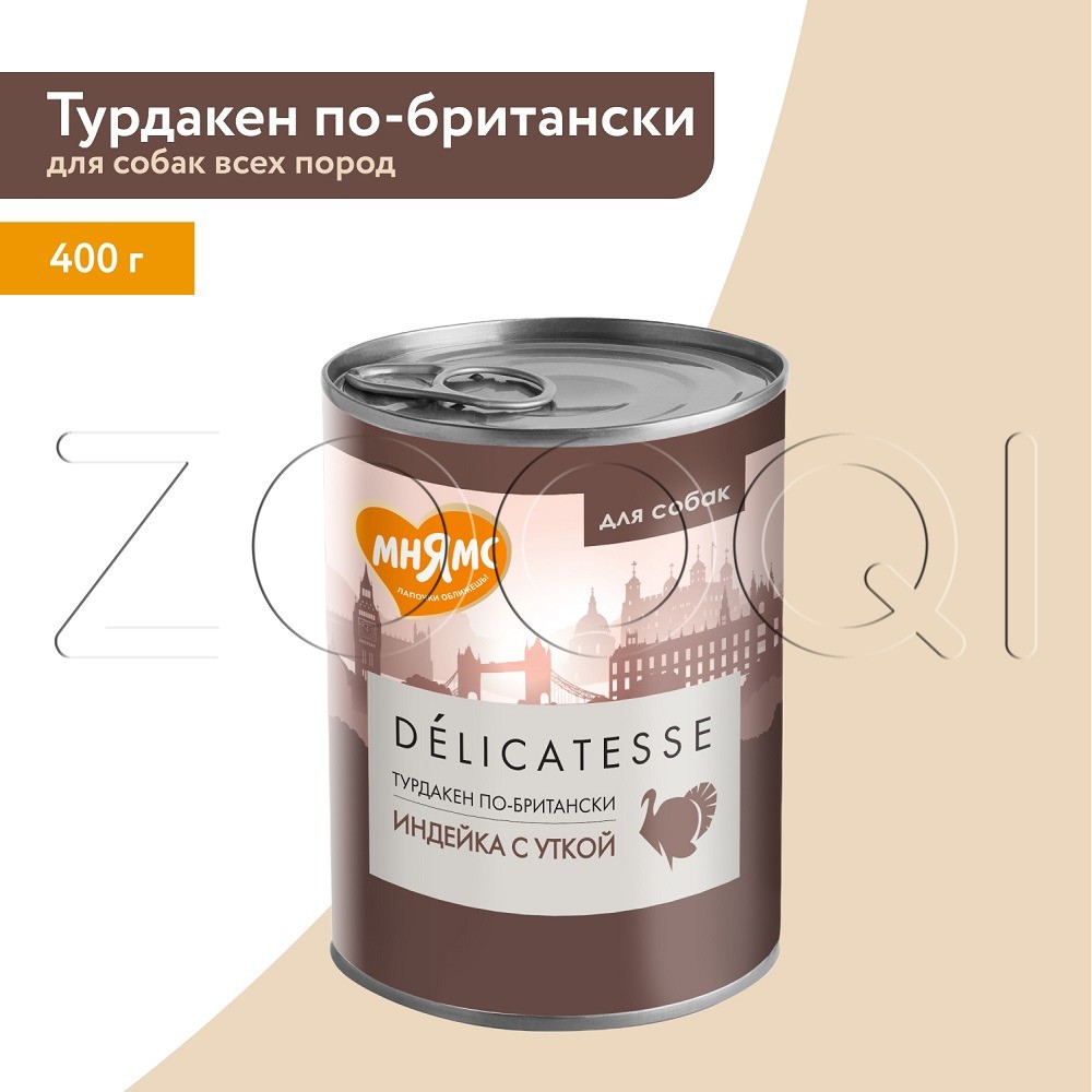 Мнямс «Турдакен по-британски» – полнорационный консервированный корм из индейки с уткой для собак. Суперпремиальный паштет с высоким содержанием мяса, созданный по мотивам культовых рецептов разных стран, адаптированных под собак всех пород.