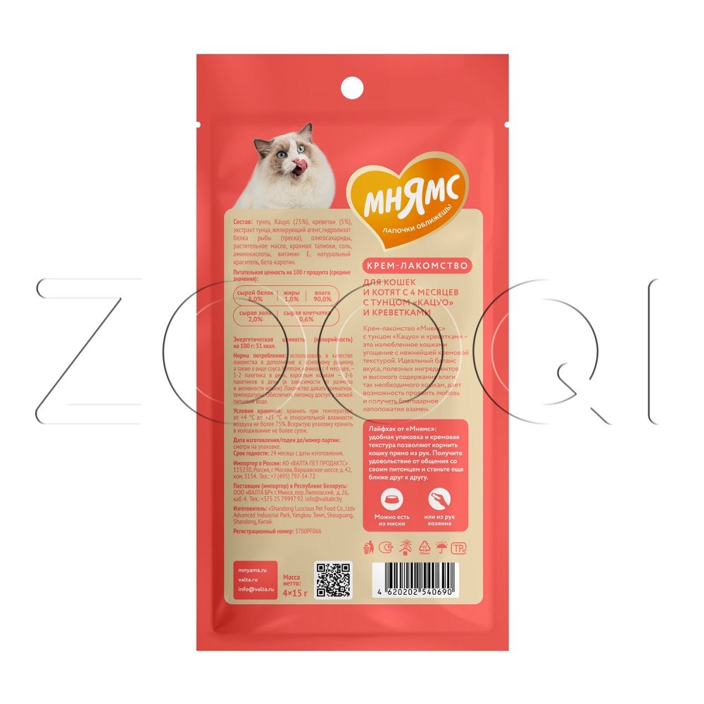 Крем-лакомство «Мнямс» с тунцом "Кацуо" и креветками – это излюбленное кошками угощение с нежнейшей кремовой текстурой. Идеальный баланс вкуса, полезных ингредиентов и высокого содержания влаги, так необходимого кошкам, дает возможность проявить любовь и получить благодарное лапопожатие взамен.