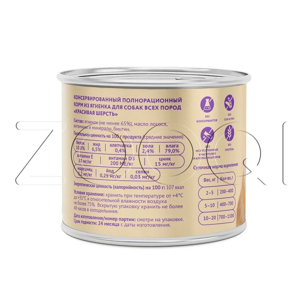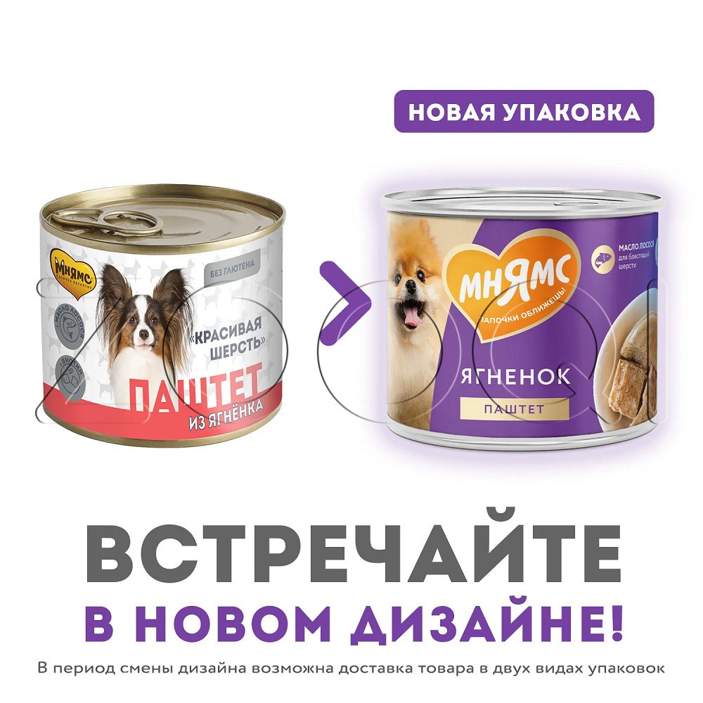 Мнямс «Красивая шерсть» – консервированный полнорационный корм из ягненка для собак всех пород.