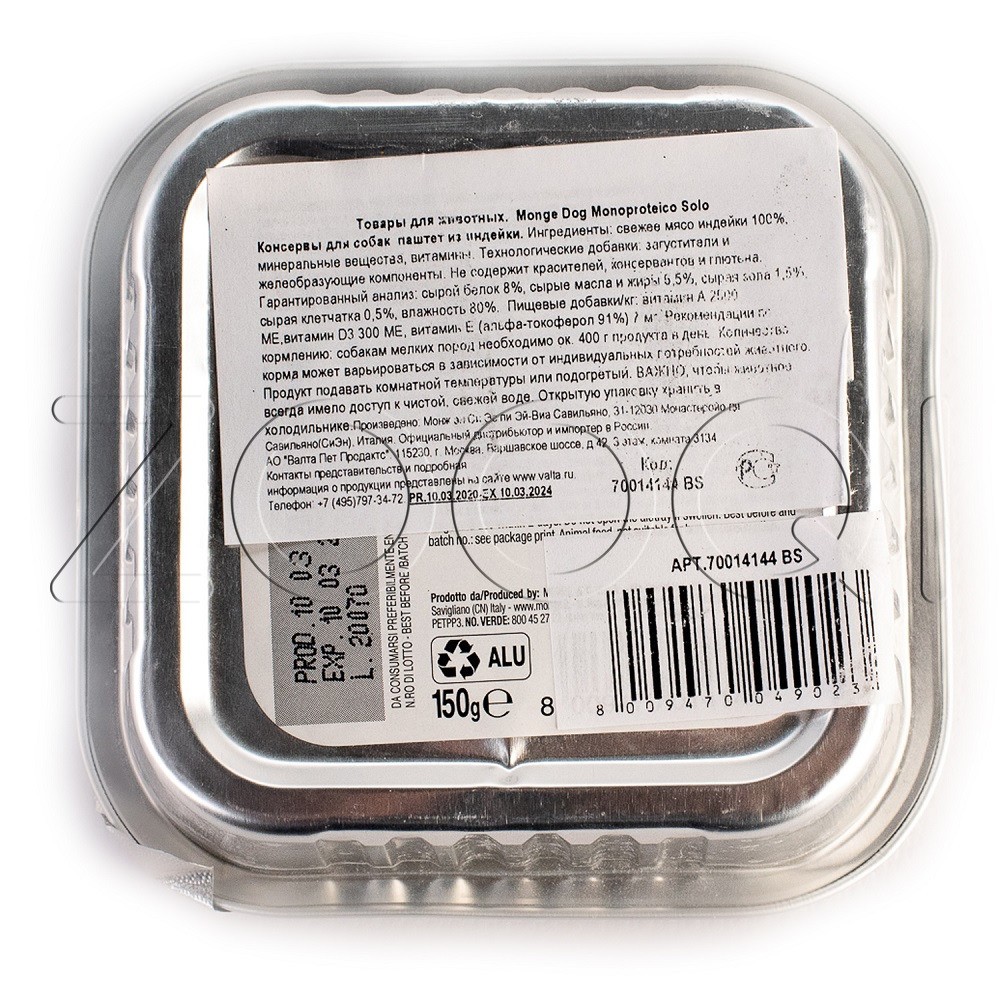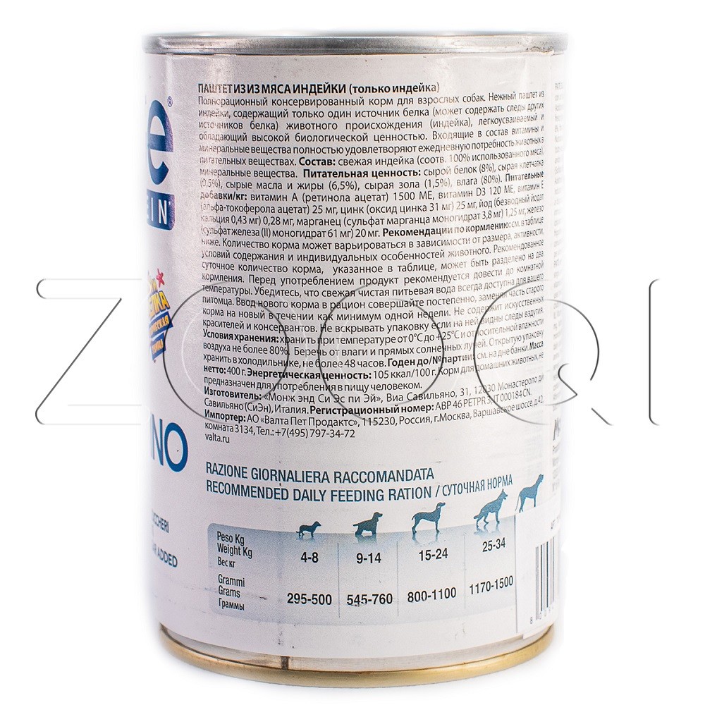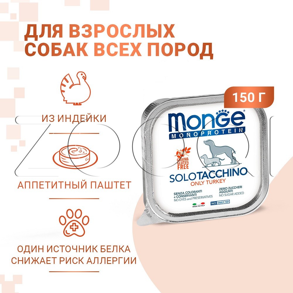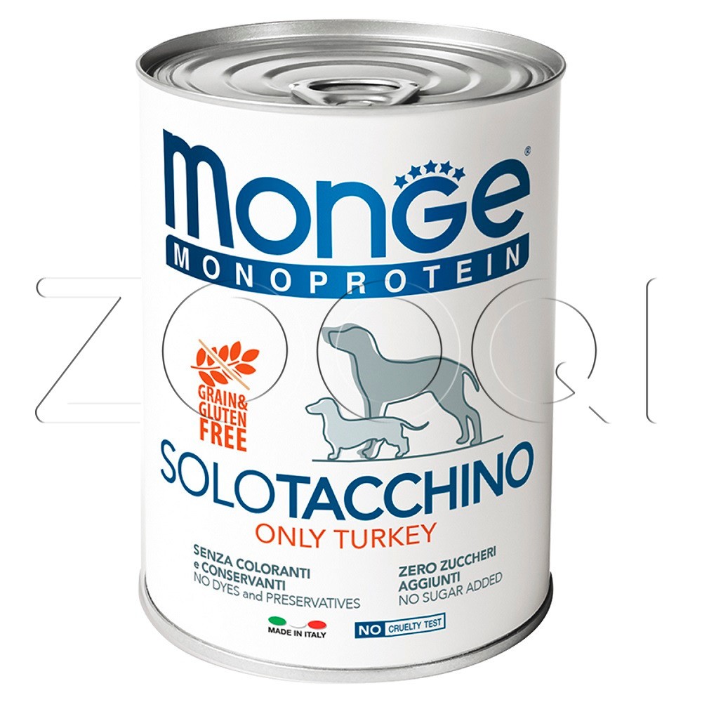 Monge Dog Monoprotein Solo Turkey — полнорационный беззерновой влажный корм из мяса индейки для взрослых собак всех пород.