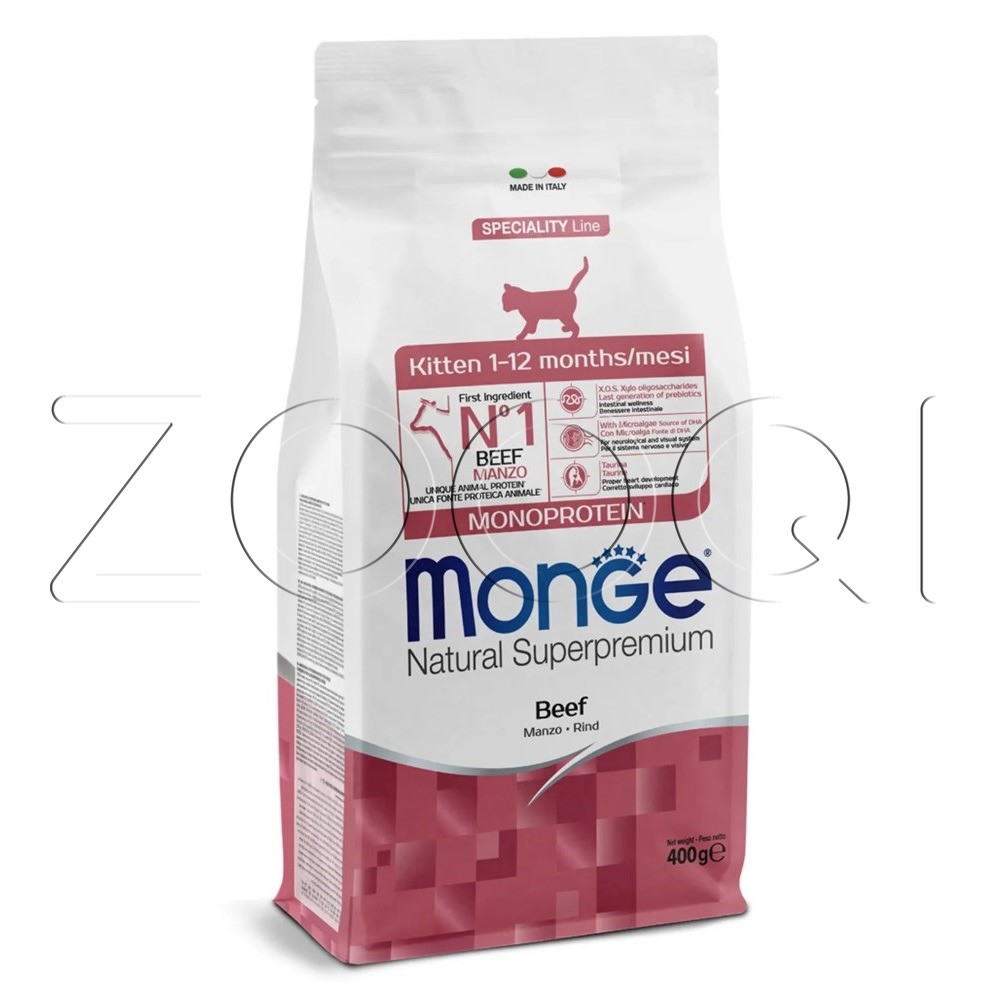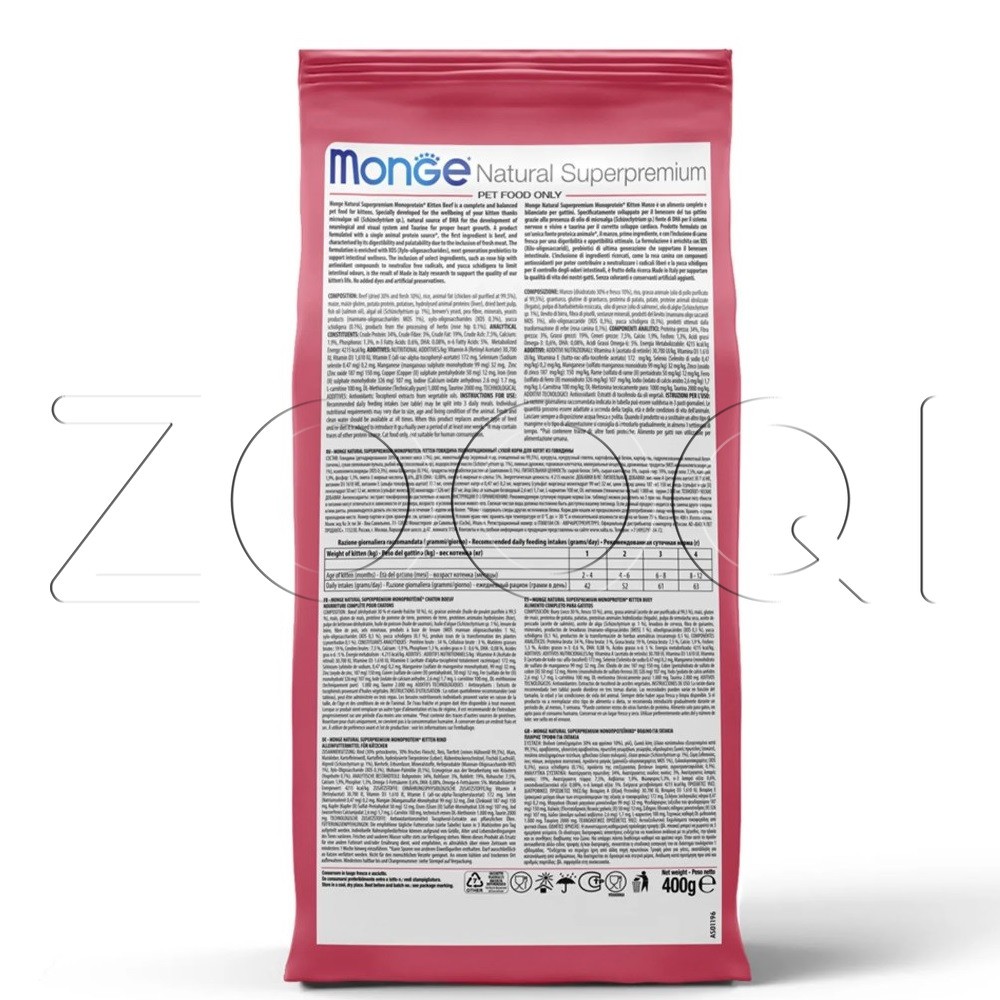 Monge Cat Speciality Line Monoprotein Kitten Beef — монобелковый корм супер-премиум класса для котят с говядиной. Сбалансированный полнорационный корм, который разработан на основе одного источника белка животного происхождения – говядины, для котят с 1 до 12 месяцев.