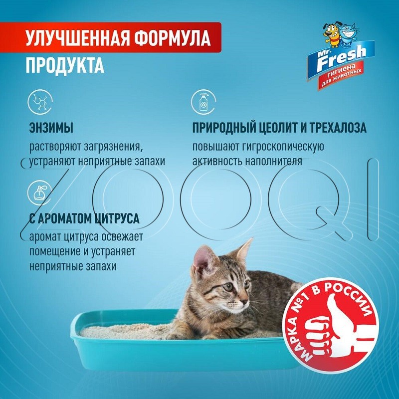 Mr. Fresh Expert Ликвидатор 2в1 для кошачьих туалетов предназначен для устранения запаха мочи и фекалий, меток животных, увеличения срока использования наполнителя.