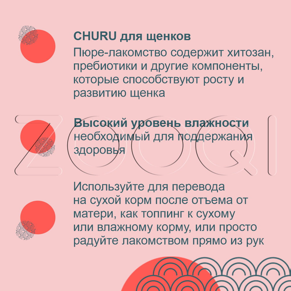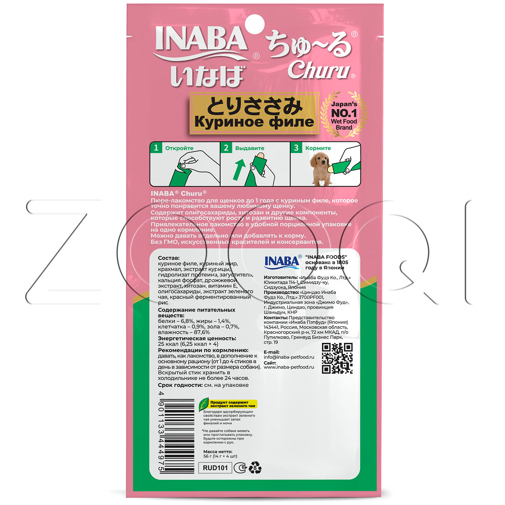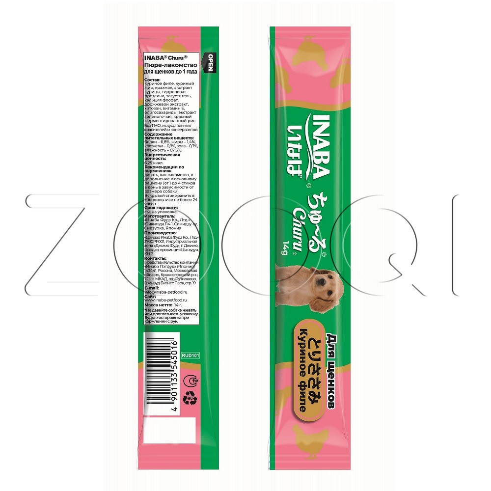 INABA Churu (Чуру) – супер-премиальное функциональное пюре-лакомство для собак на основе кусочков нежного филе фермерской курицы от японского производителя INABA изготовлено исключительно из натуральных полезных ингредиентов и отличается высоким процентом влажности, благодаря чему поддерживается водный баланс организма собаки.