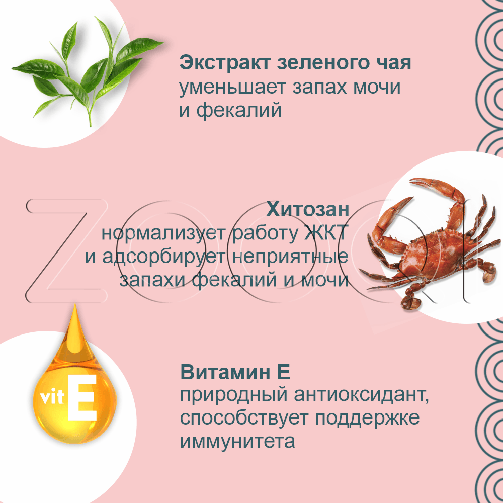Во все продукты добавлен экстракт зелёного чая, который, благодаря содержанию катехина, нейтрализует неприятные запахи содержимого кишечника.