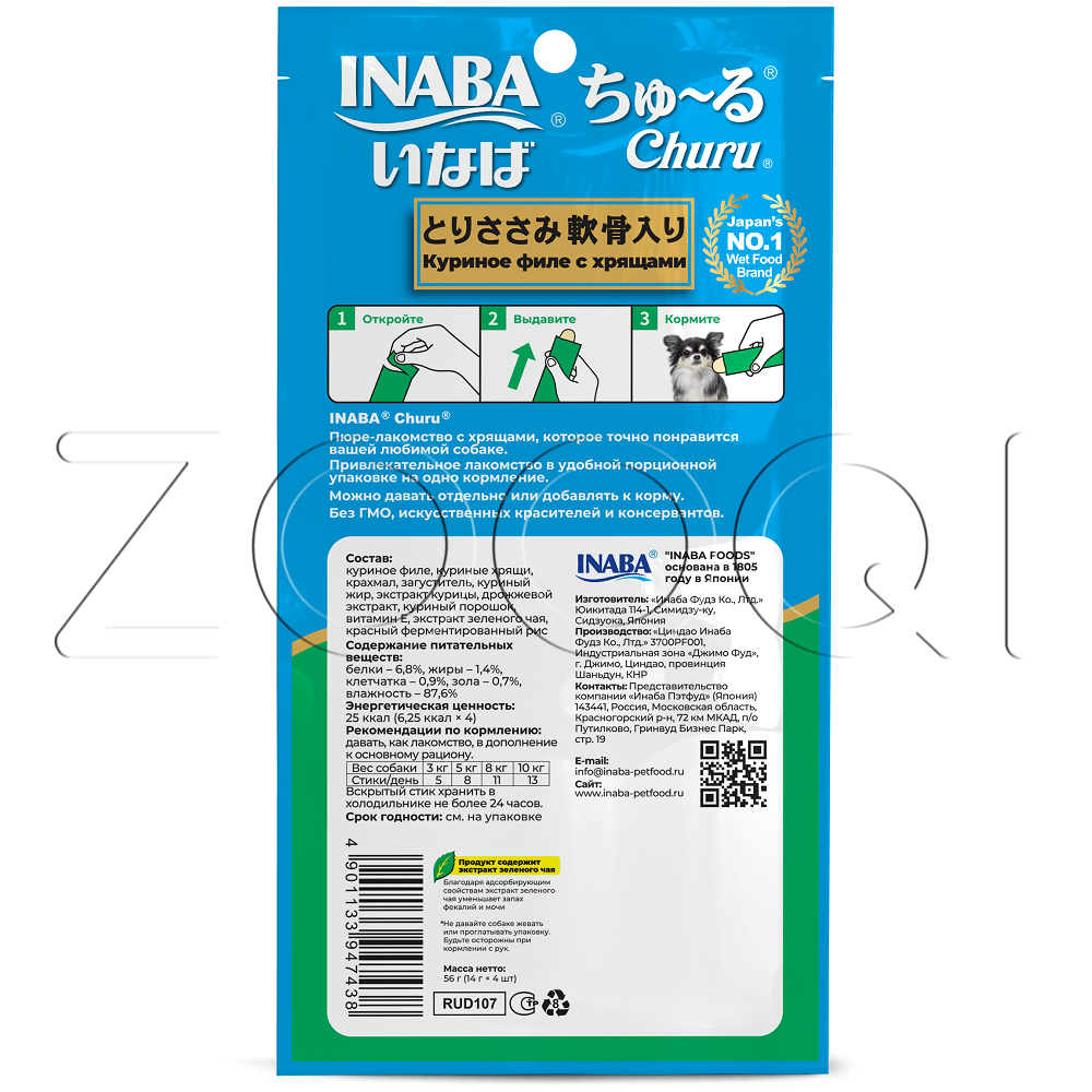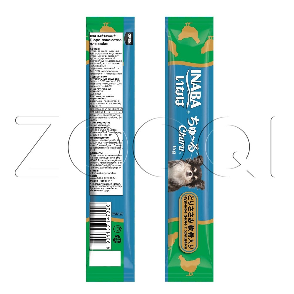 INABA Churu (Чуру) – супер-премиальное пюре-лакомство для собак на основе кусочков нежного филе фермерской курицы с хрящами от японского производителя Inaba изготовлено исключительно из натуральных полезных ингредиентов и отличается высоким процентом влажности, благодаря чему поддерживается водный баланс организма собаки. Кремовая текстура, напоминяющая пюре или суп, подойдет даже самым привередливым собакам или собакам с чувствительным пищеварением.