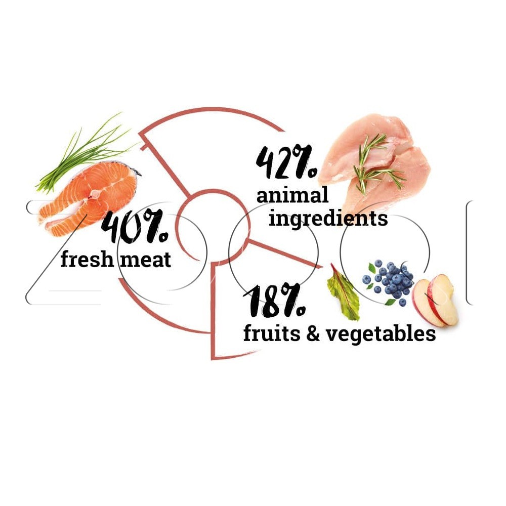 Лосось (свежий 40%*, обезвоженный 10%), дегидрированное мясо индейки 20%, смесь фруктов и овощей 18% (зеленый горошек, свекольный жом, морские водоросли, сушеные яблоки, сушеная клюква, сушеная черника, сушеная малина), сушеный фермерский картофель , птичий жир 10%, дегидрированная мякоть картофеля, дегидрированное мясо тунца (2,5 %), гидролизованный животный белок, картофельный белок, дрожжи, фруктоолигосахариды (сушеный корень цикория), юкка, льняное семя, рыбий жир, сушеные травы (крапива, ромашка, экстракт мяты, листья календулы, горечавка, фенхель), глюкозамин, хондроитин сульфат. * до экструзии