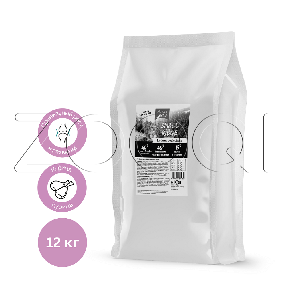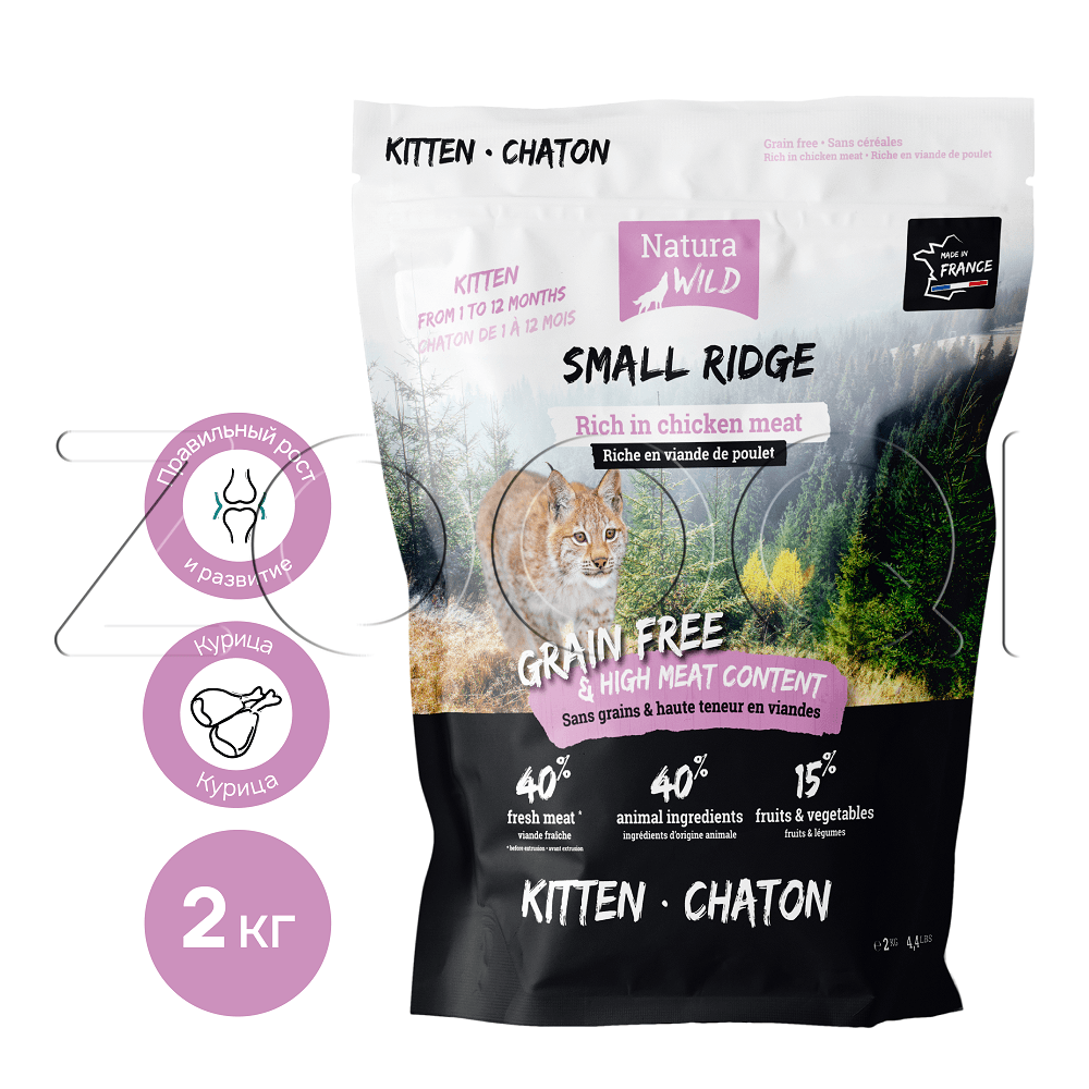 Natura Wild Small Ridge Kitten — полнорационный беззерновой корм для котят от отъема до 12 месяцев, беременных и кормящих кошек. Рецепт этих гранул, специально адаптированный для котят, ускоряет их рост, укрепляет кости и развивает органы. При этом укрепляется их иммунная система.