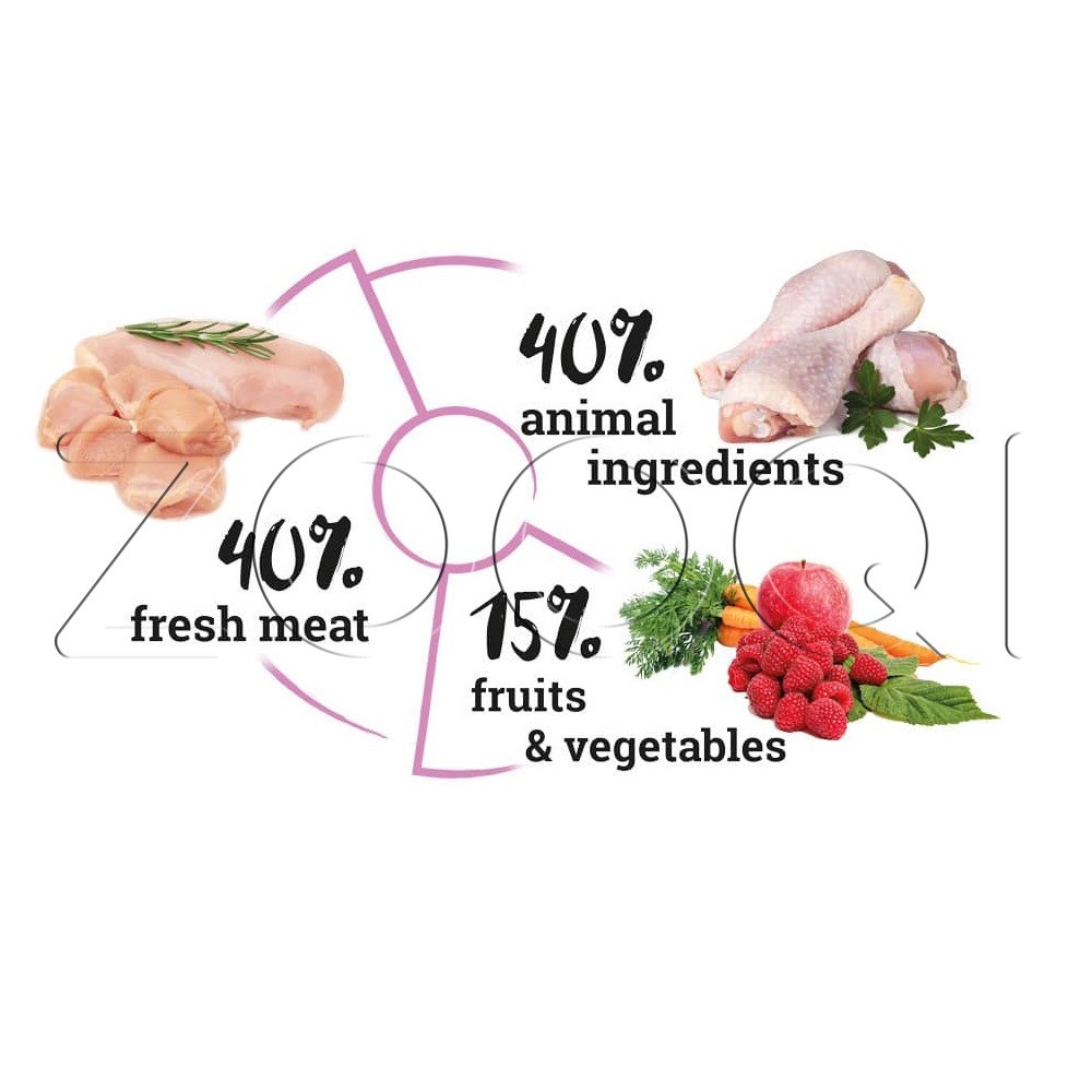Изготовлен из 40 % свежего куриного мяса и 40 % ингредиентов животного происхождения. Корм содержит все необходимые растущему организму аминокислоты, чтобы обеспечить правильный рост, развитие и удовлетворить потребности в энергии.
