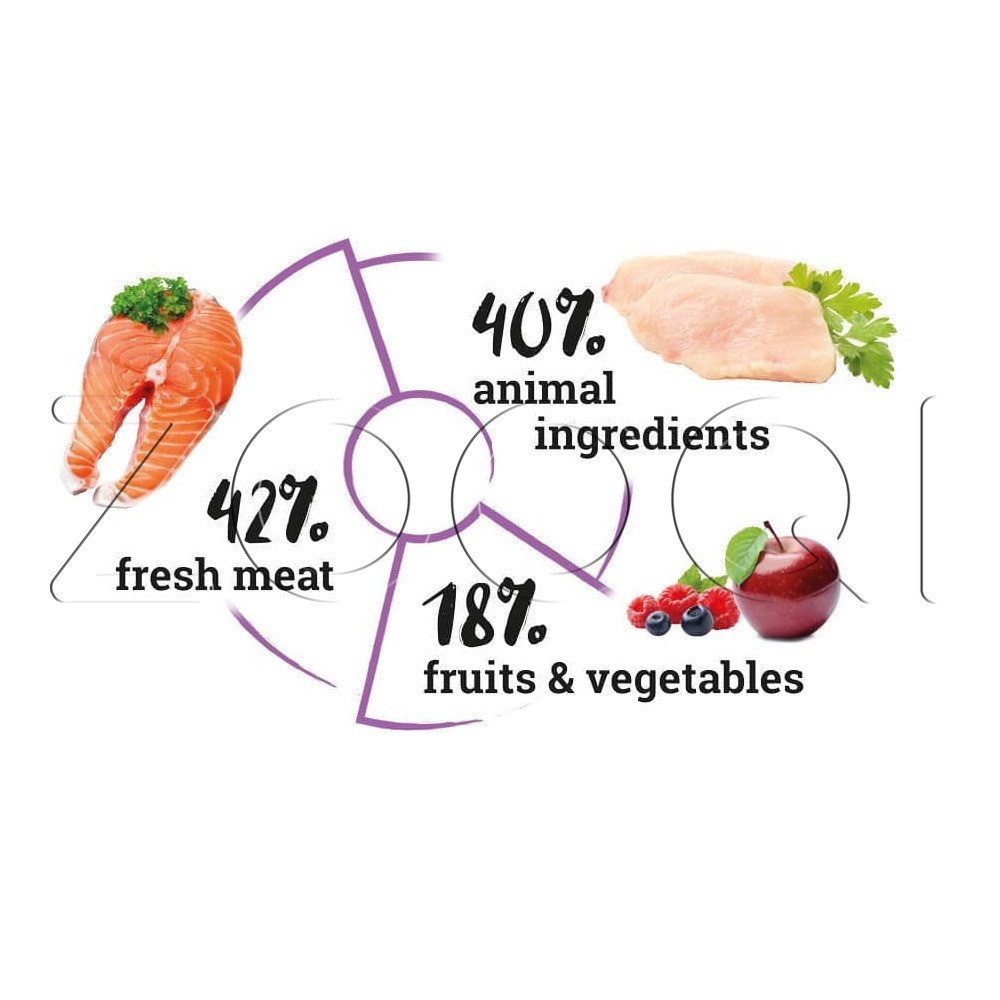 Лосось (свежий 42%*, обезвоженный 11%), обезвоженная индейка мясо 19%, смесь фруктов и овощей 18% (зеленый горошек, жом свеклы, морские водоросли, яблоки сушеные, клюква сушеная, сушеные черника, сушеная малина), сушеный фермерский картофель, птица жир 9%, обезвоженная мякоть картофеля, дегидратированное мясо тунца 2,5%, гидролизованный животный белок, картофельный белок, дрожжи, фрукто- олигосахарид (сушеный корень цикория), юкка, льняное семя, рыба масло, сушеные травы (крапива, ромашка, экстракт мяты, календулы листья, горечавка, фенхель), глюкозамин, хондроитин сульфат. * перед экструзией