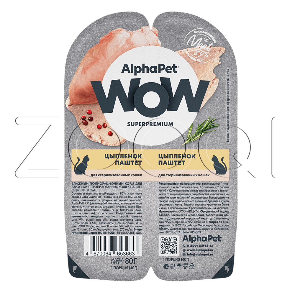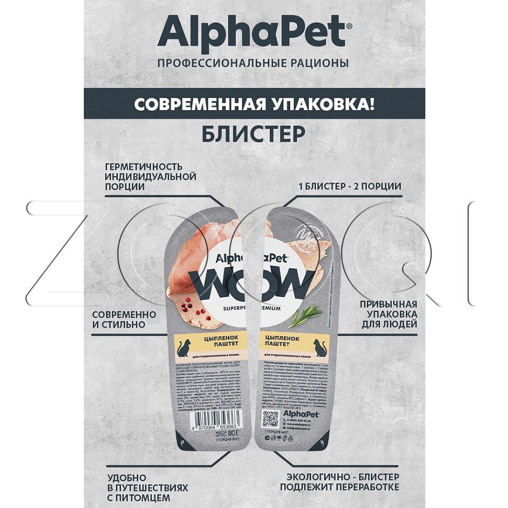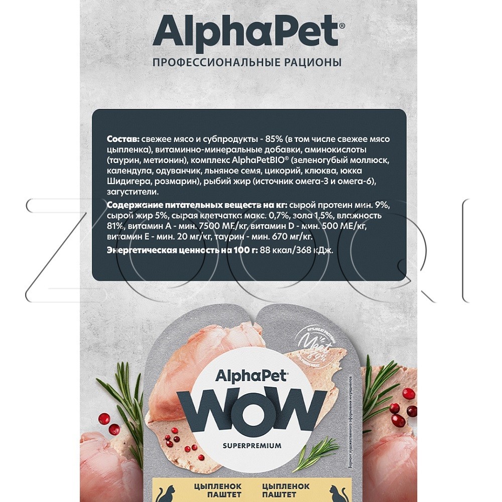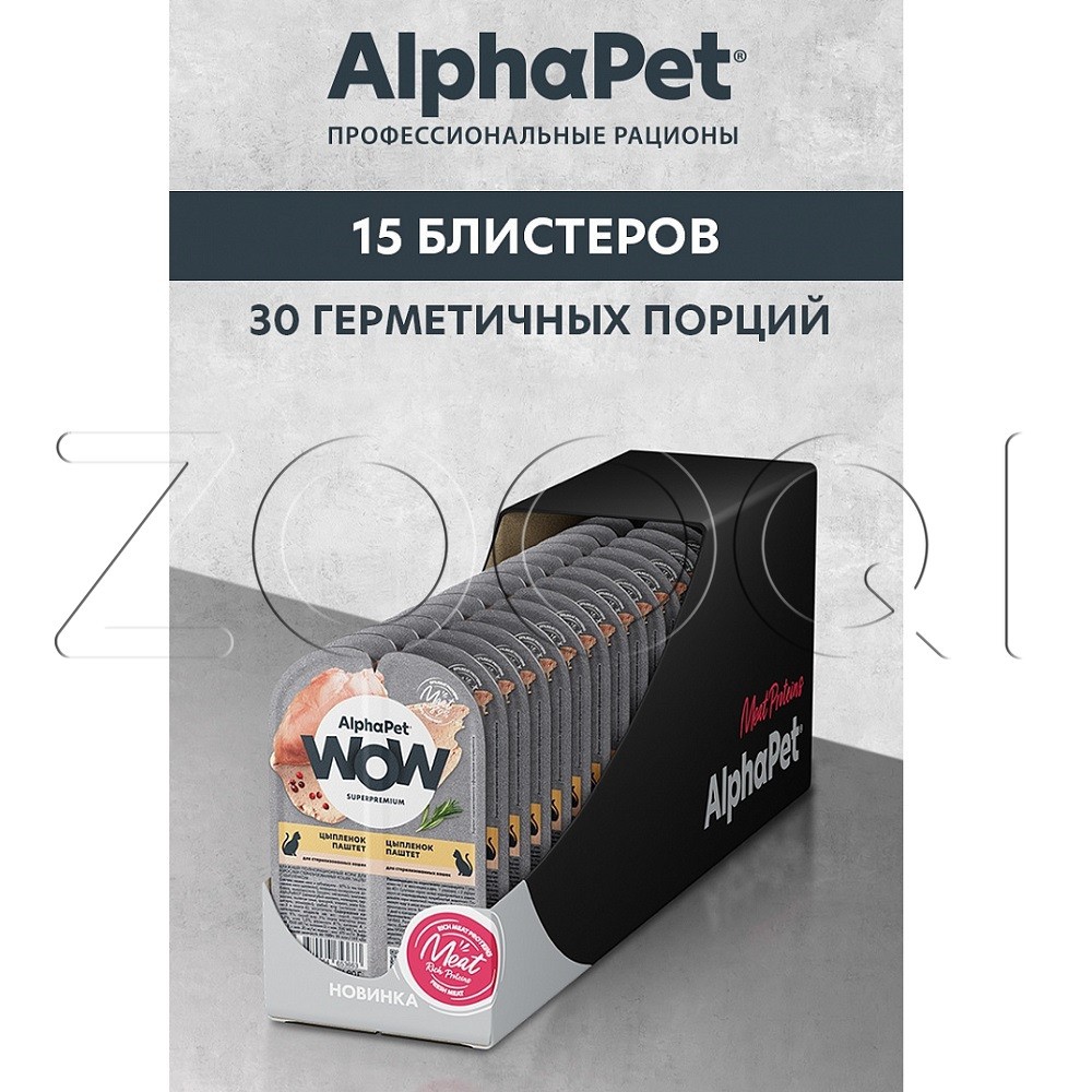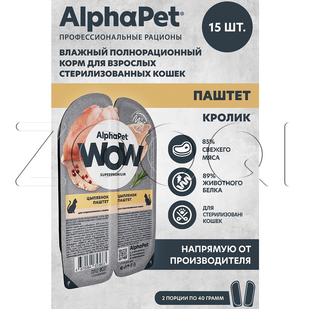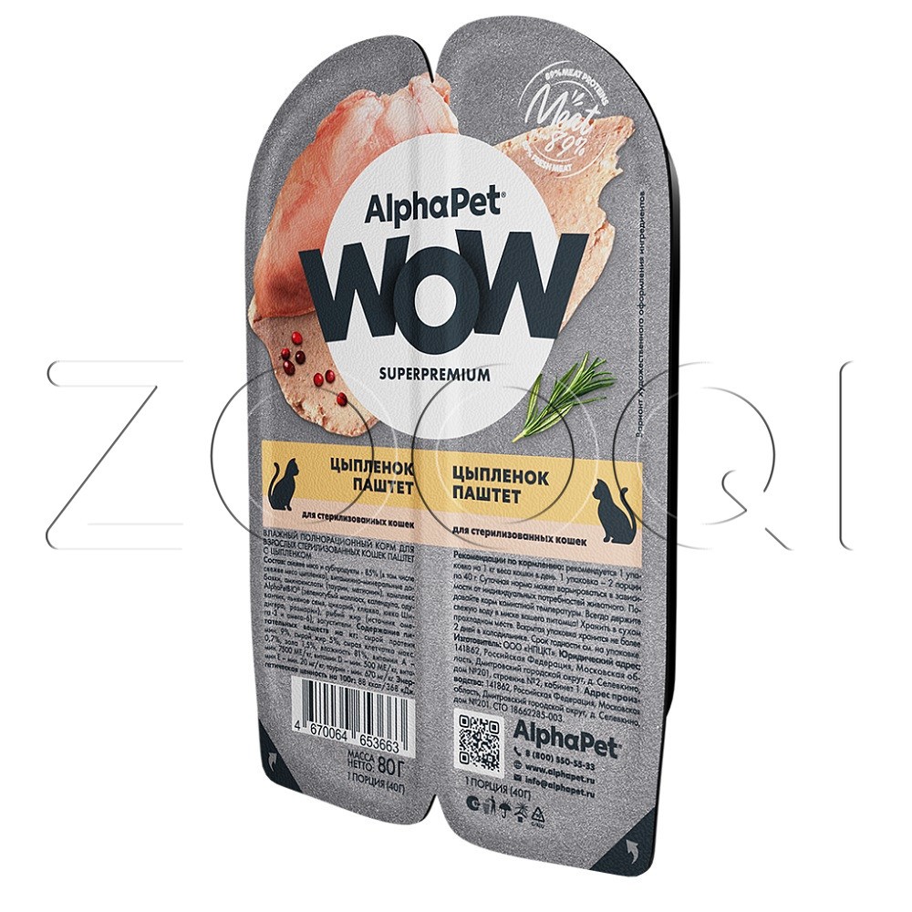 AlphaPet WOW Superpremium – влажный полнорационный корм для взрослых стерилизованных кошек паштет с цыпленком.