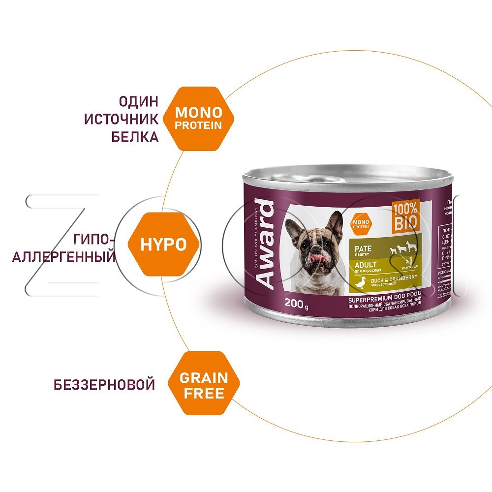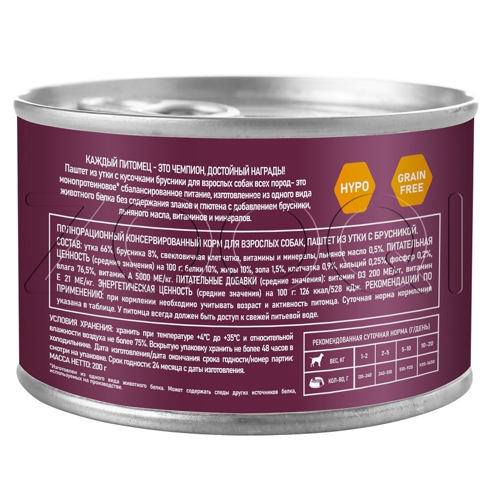 Паштет из утки с кусочками брусники для взрослых собак - это монопротеиновое сбалансированное питание для любимого питомца, изготовленое из одного вида мясного белка без содержания зерна и глютена, с добавлением овощей и фруктов богатых витаминами и минералами.
