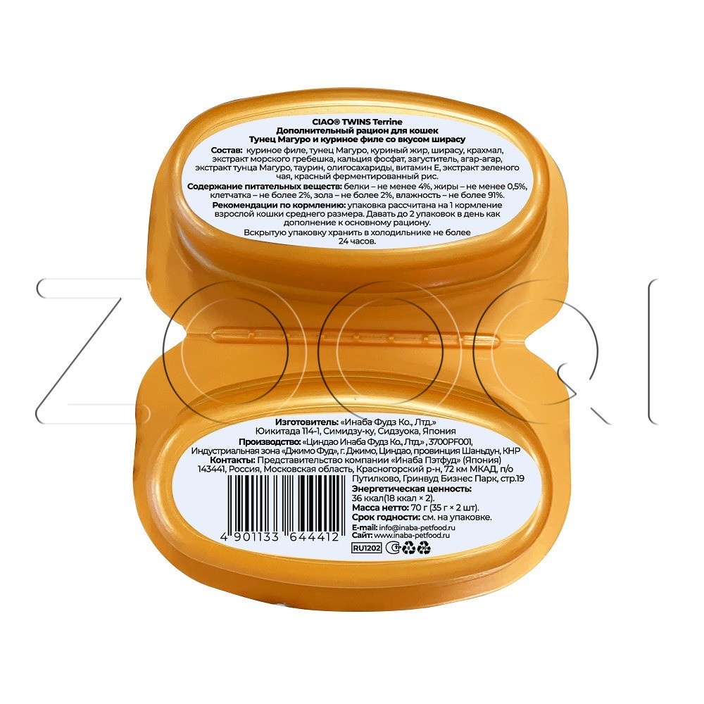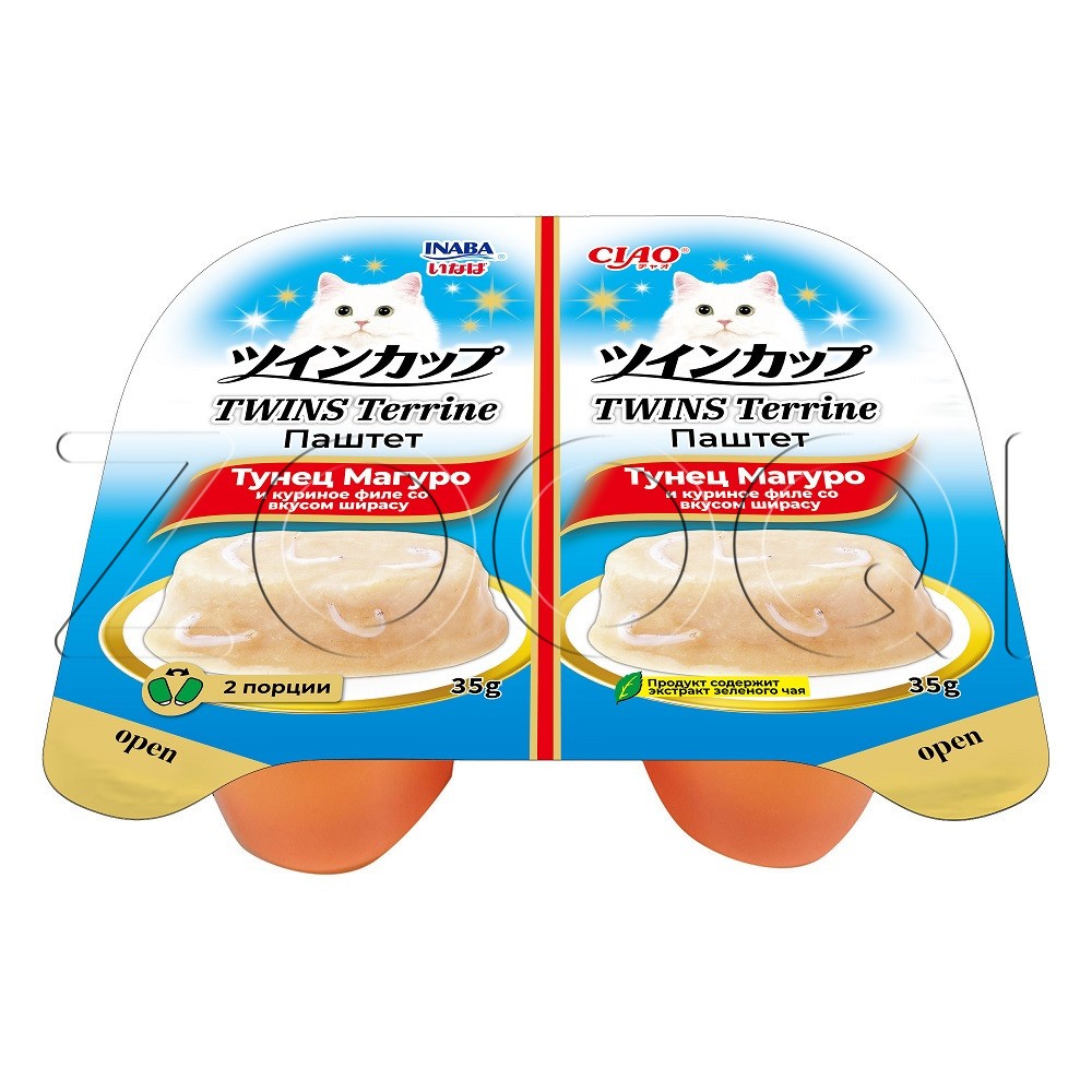 INABA CIAO TWINS Terrine (Чао Твинс Террин) – супер-премиальный паштет для кошек от японского производителя INABA, приготовлен на основе мяса глубоководного тунца Магуро и кусочков филе фермерской курицы с добавлением ширасу. Внутри упаковки влажный корм в виде нежного паштета, который подойдет даже самым привередливым кошкам и кошкам с чувствительным пищеварением.