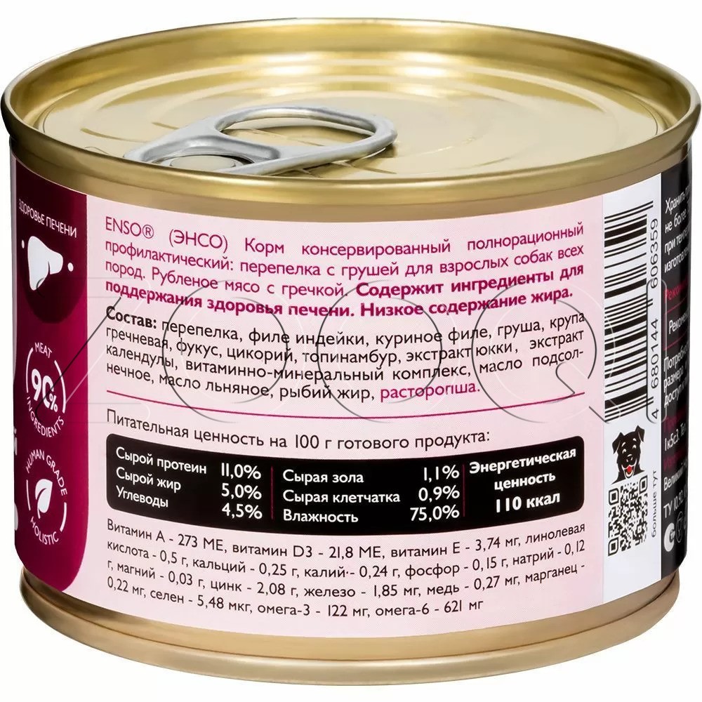 Enso Sensitive c перепелкой обогащен специальными функциональными добавками для поддержания здоровья печени взрослых собак: