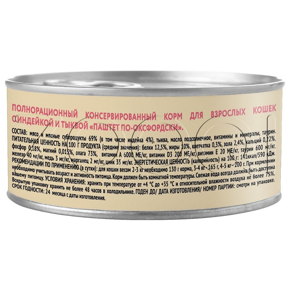 «Паштет по-оксфордски» содержит высокое количество животного белка (69%), тыкву, таурин, а также все необходимые витамины и минералы для поддержания здоровья и активности кошки на протяжении всей ее жизни.