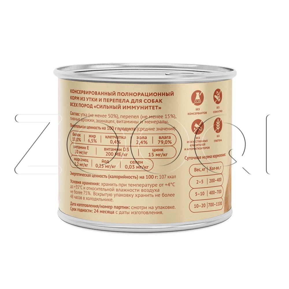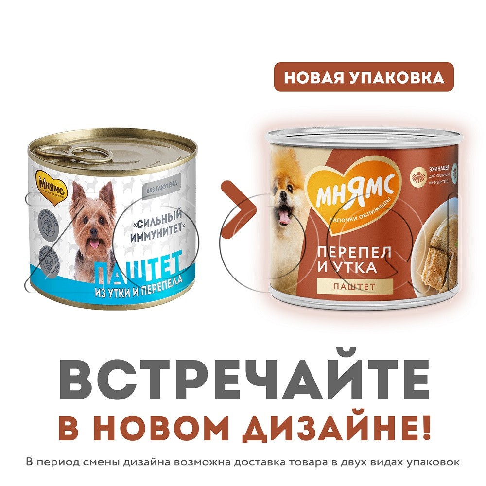Мнямс «Сильный иммунитет» – консервированный полнорационный корм из утки и перепела для собак всех пород.