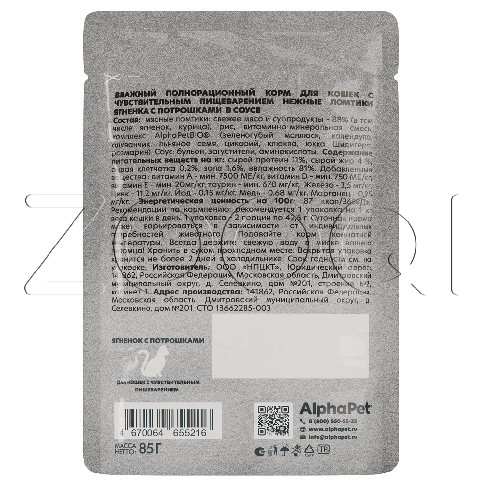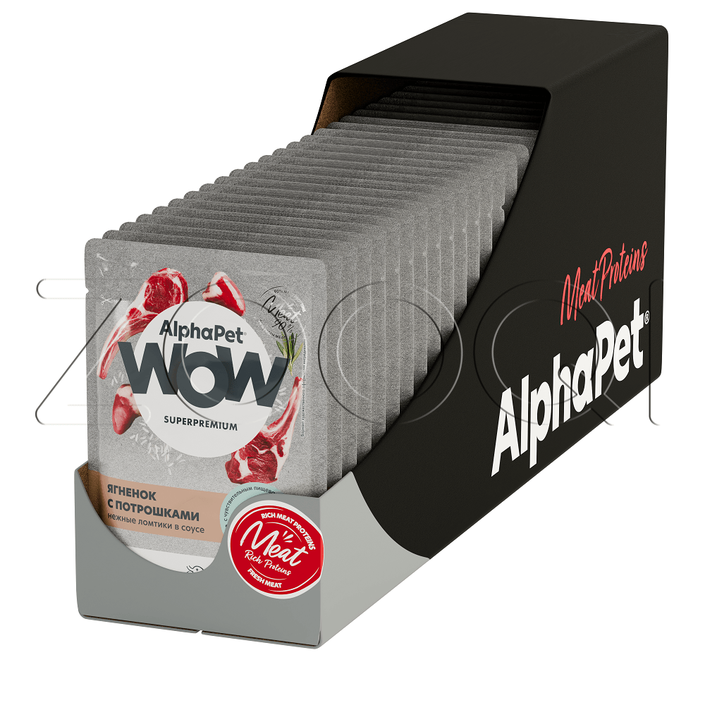 AlphaPet WOW Superpremium – влажный полнорационный корм для кошек с чувствительным пищеварением, нежные ломтики ягненка с потрошками в соусе.